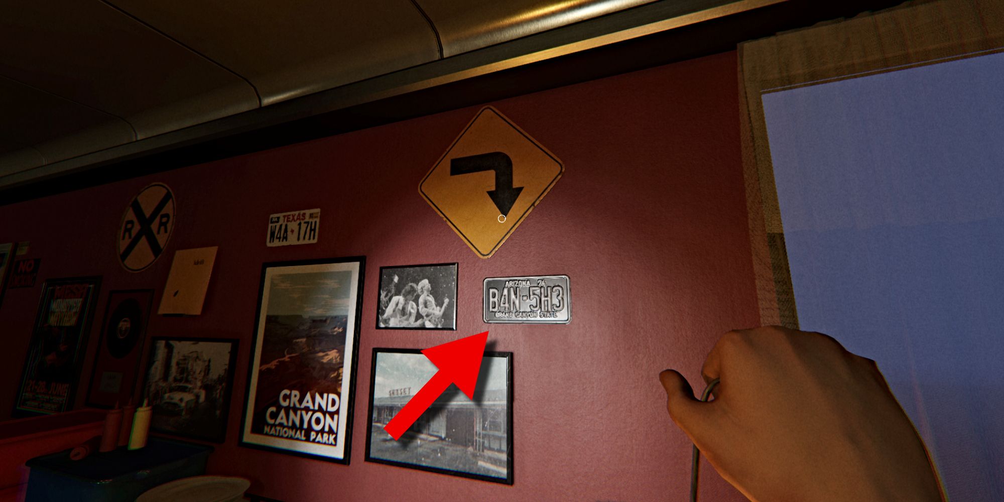 Теперь направляйтесь в обеденную зону закусочной возле входа. Посмотрите на большой жёлтый дорожный знак на стене справа от входа. На нём есть стрелка, указывающая вниз на первое число – 4 – на номерном знаке, расположенном под ним.