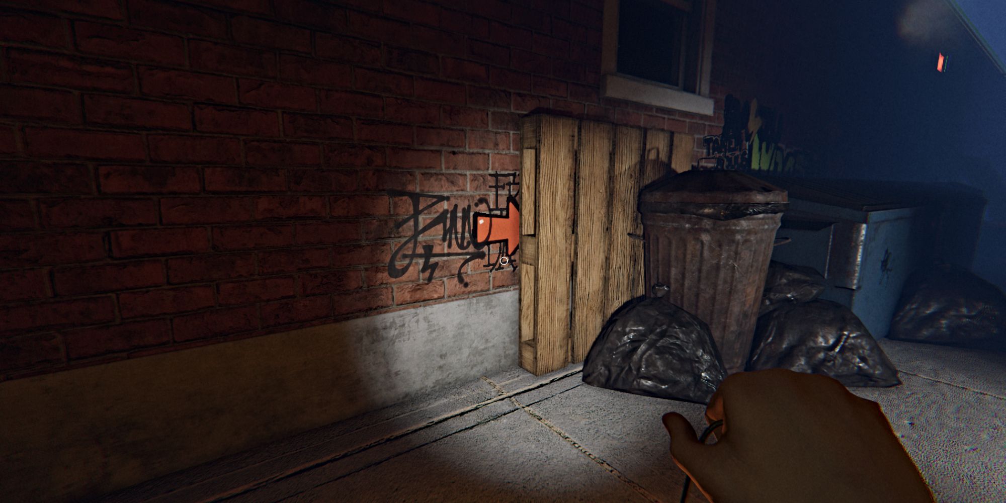 Затем направляйтесь в правую часть закусочной Nell’s Diner. Вы увидите ряд мусорных баков и контейнеров. Ищите ярко-красную стрелку на кирпичной стене, на самом левом краю — она может быть частично скрыта деревянным поддоном. Стрелка указывает вправо.