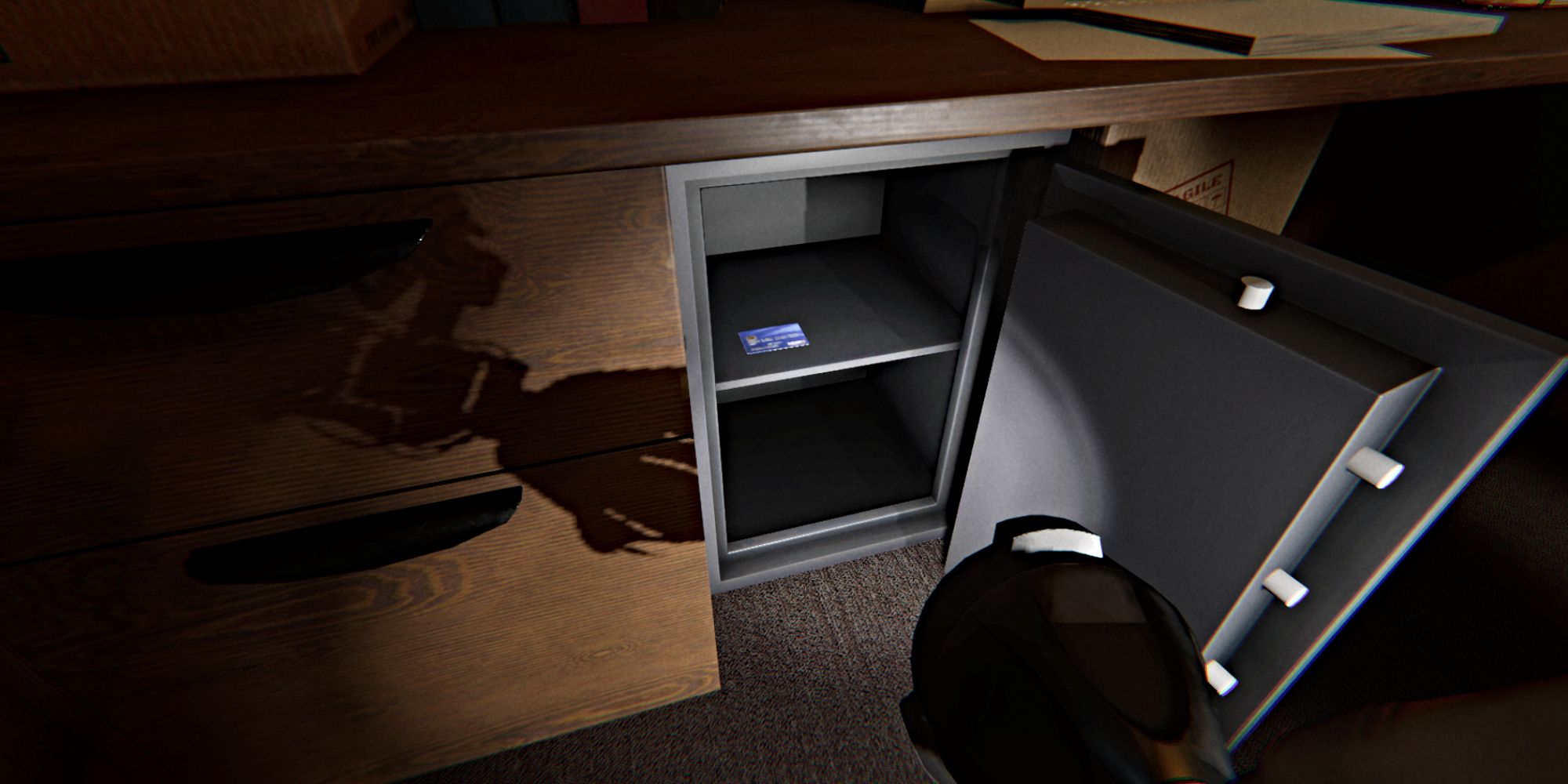 Чтобы открыть сейф, подойдите к нему, и появится клавиатура. Введите код 415, затем нажмите кнопку ‘Submit’. Это откроет сейф, позволяя вам открыть дверь и забрать Синюю карту банкомата внутри. Подберите карту так же, как и любой другой предмет в игре.