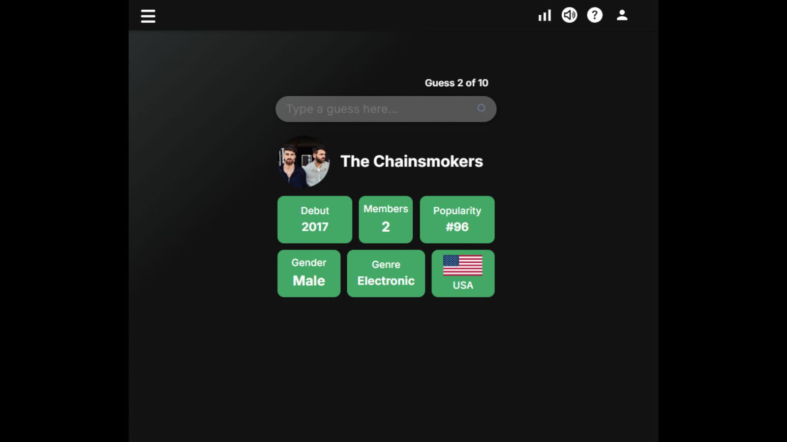 Прочитать отчет 10-KПодобно вчерашнему дню, ваша первоначальная догадка в сегодняшнем Spotle будет полностью случайной. После этого вам будут даны подсказки, такие как год дебюта исполнителя, страна или жанр, чтобы помочь вам выяснить, кто это. Если вы угадаете подсказку правильно, она станет зелёной. Если вы на правильном пути, но ещё не совсем там, она станет жёлтой.
