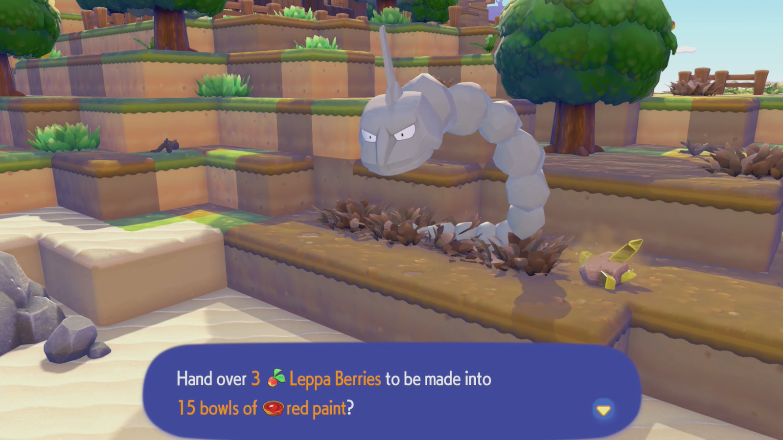 - Используйте Покемонов со специализацией «Дробление»: Собрав ягоды, отнесите их Покемону, обладающему специализацией «Дробление», чтобы переработать их в краску. Покемоны, такие как Onix, Steelix и Conkeldurr, являются отличным выбором для этого. Этот процесс занимает некоторое время, поэтому пока поищите больше ягод по всему миру.