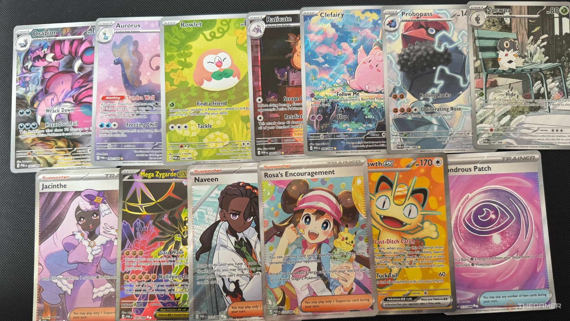 Четыре редкие карты Special Art (SAR) Pokémon – Mega Starmie ex, Mega Clefable ex, Mega Zygarde ex и Meowth ex – все качественно сделаны и выглядят хорошо. Они визуально привлекательны, но не особенно инновационны и не демонстрируют самых популярных Pokémon, за исключением, возможно, Meowth.