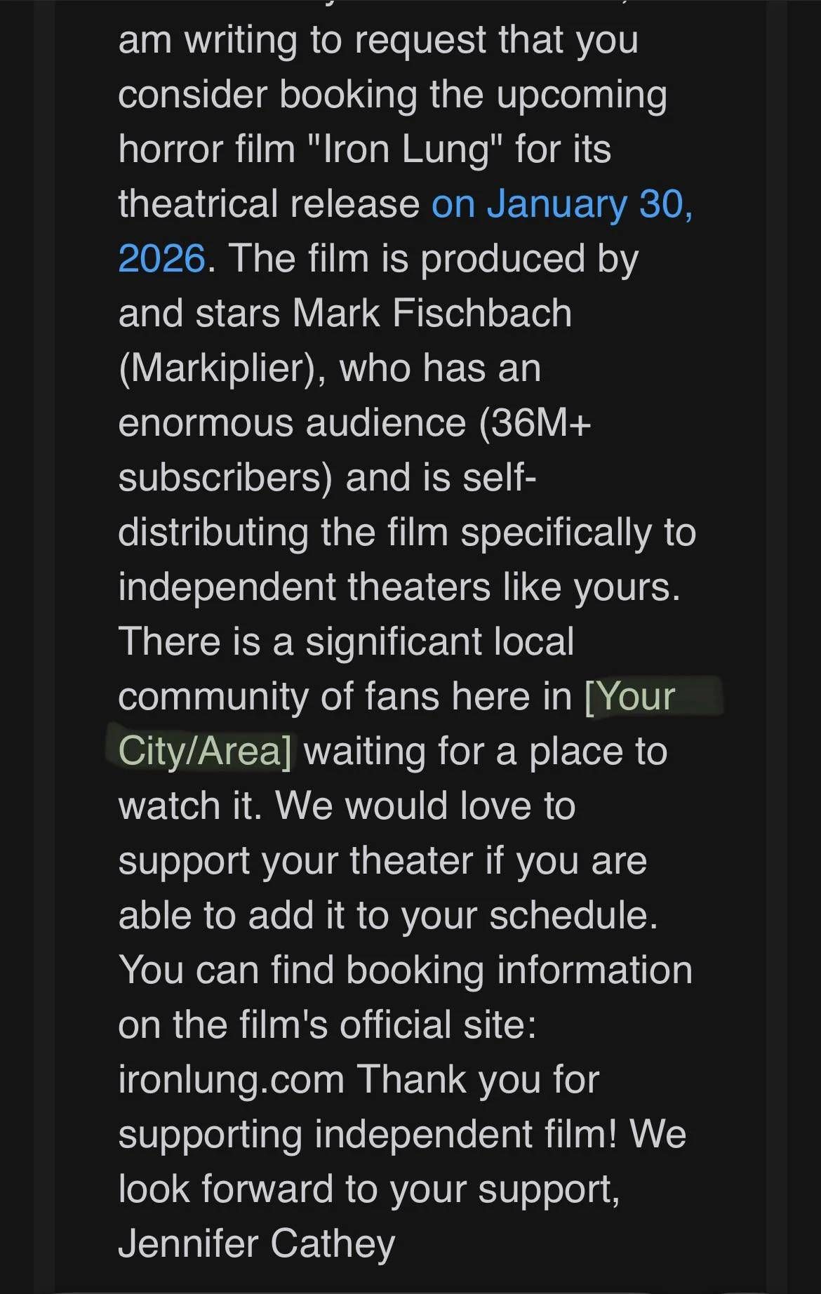 Прежде чем я закончу, позвольте мне уточнить: я думаю, это здорово, что кинотеатры показывают Iron Lung! Круто, что человек с большой онлайн-аудиторией помогает распространять игру David Szymanski. Однако скоординированные усилия по обращению в несколько кинотеатров по всей стране кажутся мне созданием искусственного спроса. Обсуждение на Reddit показывает, что есть подлинный интерес поклонников, и я понимаю, откуда берется этот энтузиазм. Но сотрудники кинотеатров, вероятно, были бы благодарны, если бы люди перестали отправлять одинаковые, звучащие как автоматические сообщения, в которых указывается их город или район!