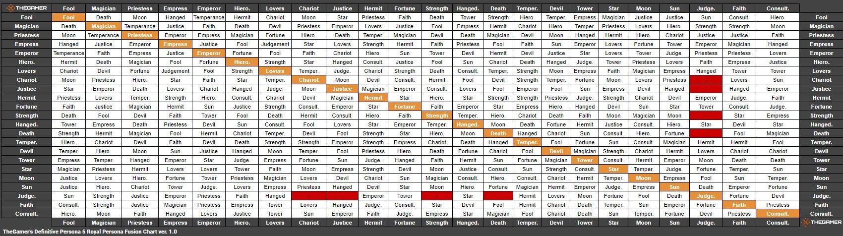 Таблицы ниже показывают самые дешевые рецепты для каждой Персоны в Persona 5 Royal. Однако, выяснение того, какую Персону вы получите в результате фьюжна, требует некоторых точных расчетов. Наиболее важным фактором является уровень по умолчанию тех Персон, которые вы объединяете – насколько вы их прокачали, не имеет значения. Используется только их начальный уровень, указанный в таблицах, чтобы определить результат фьюжна.