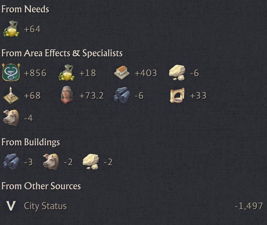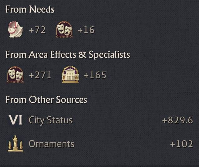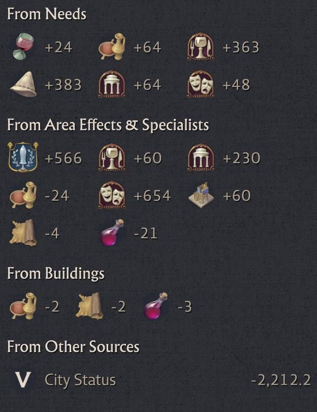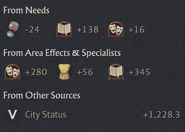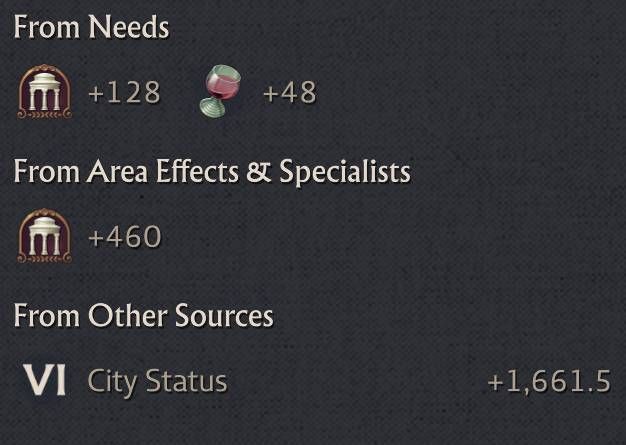 Численность населения вашего города должна напрямую соответствовать количеству там проживающих людей. Однако, уровень веры населения зависит от производства вина и специальных сооружений, таких как храмы и статуи.