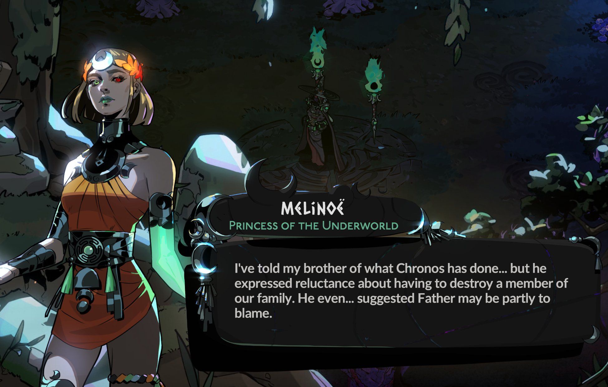 После этого мы видим детство Мелинои: она ездит на Цербере с матерью, учится фехтованию с Загреусом, красит ногти с Мегерой и проводит время со знакомыми лицами, такими как Танатос и Гипнос из оригинальной игры.