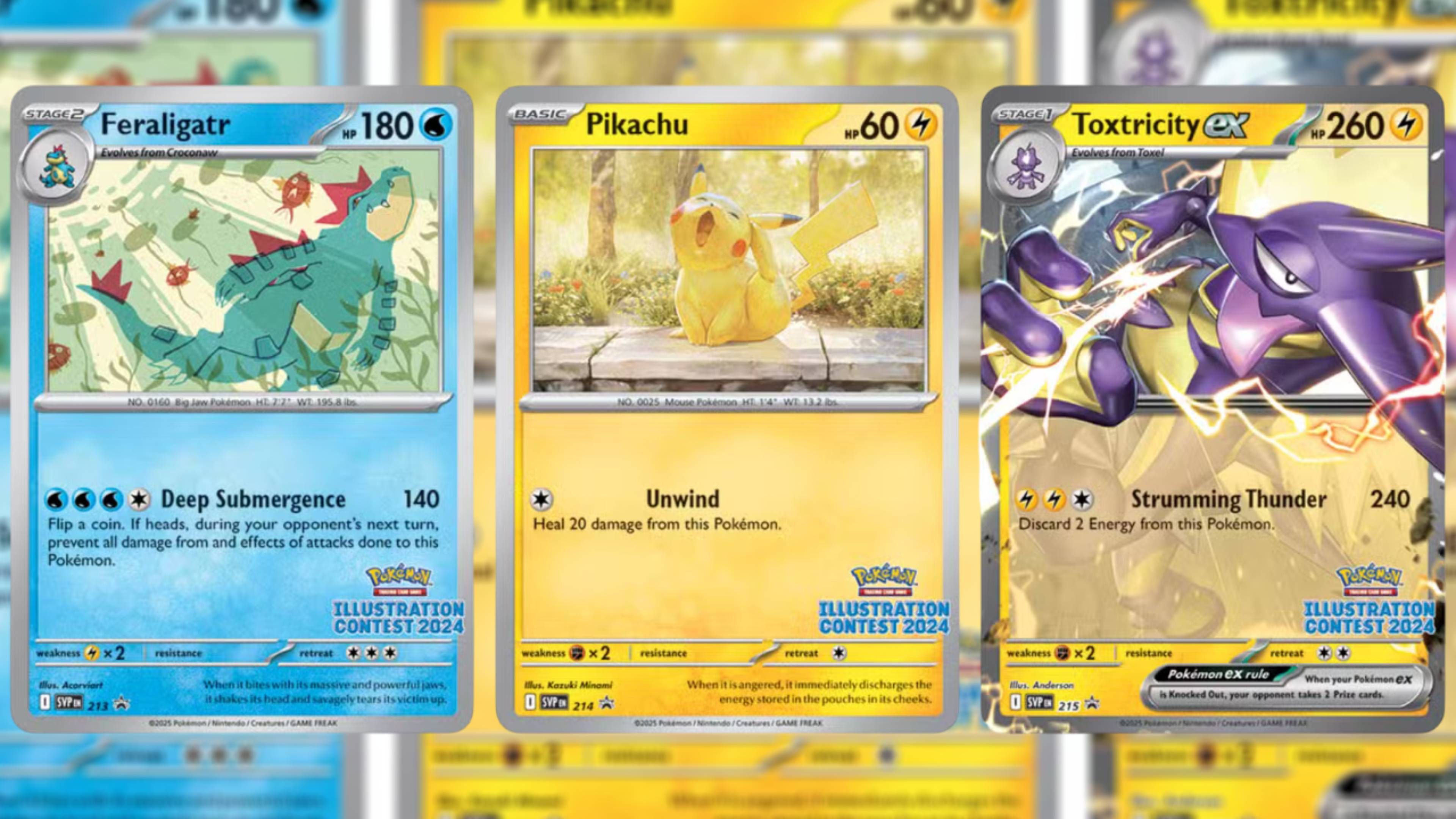 Призами стали три потрясающие карты из прошлогоднего конкурса иллюстраций. Первое место в общем зачете занял Пикачу от Казуки Минами, на котором знаменитый покемон отдыхает с большой зевотой на тротуаре. Также была включена Feraligatr от Acorviart, победитель в категории стандартной иллюстрации, вместе с Toxtricity от Anderson, который занял первое место как лучшая иллюстрация ex карта с конкурса.