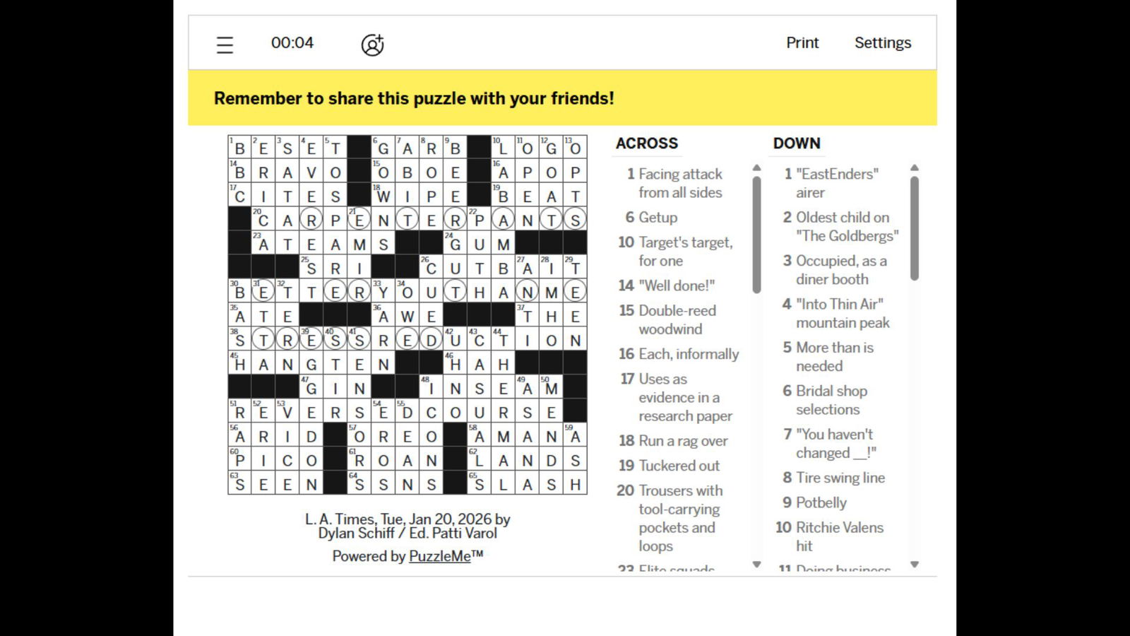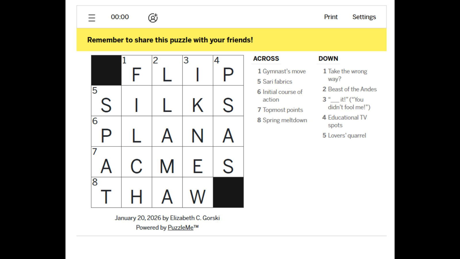 Ответы на мини-кроссворд LA Times от 20 января 2026 года.