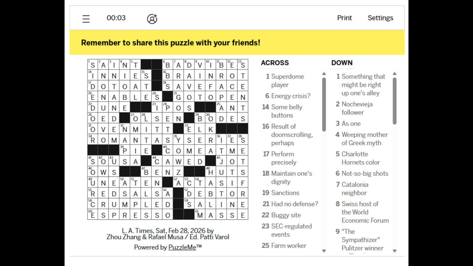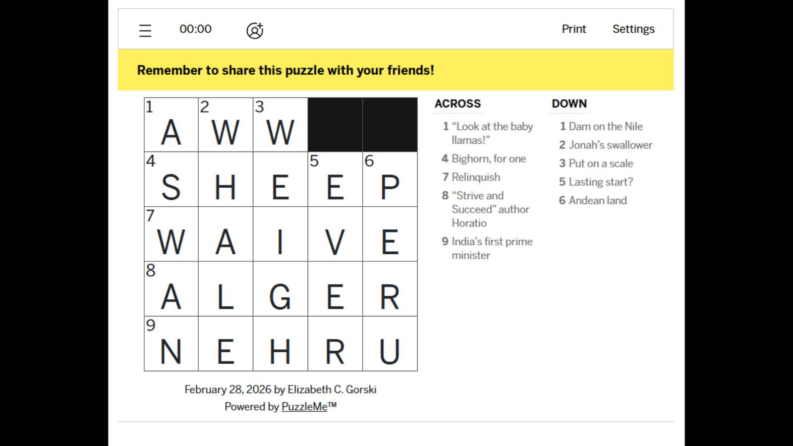 Ответы на Mini Crossword от LA Times за 28 февраля 2026 года.