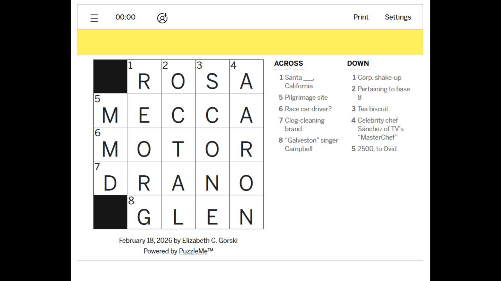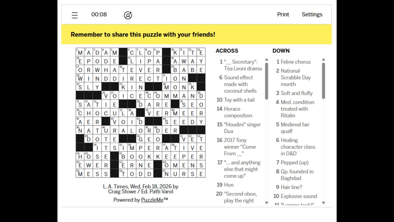 Ответы на мини-кроссворд LA Times за 18 февраля 2026 года.