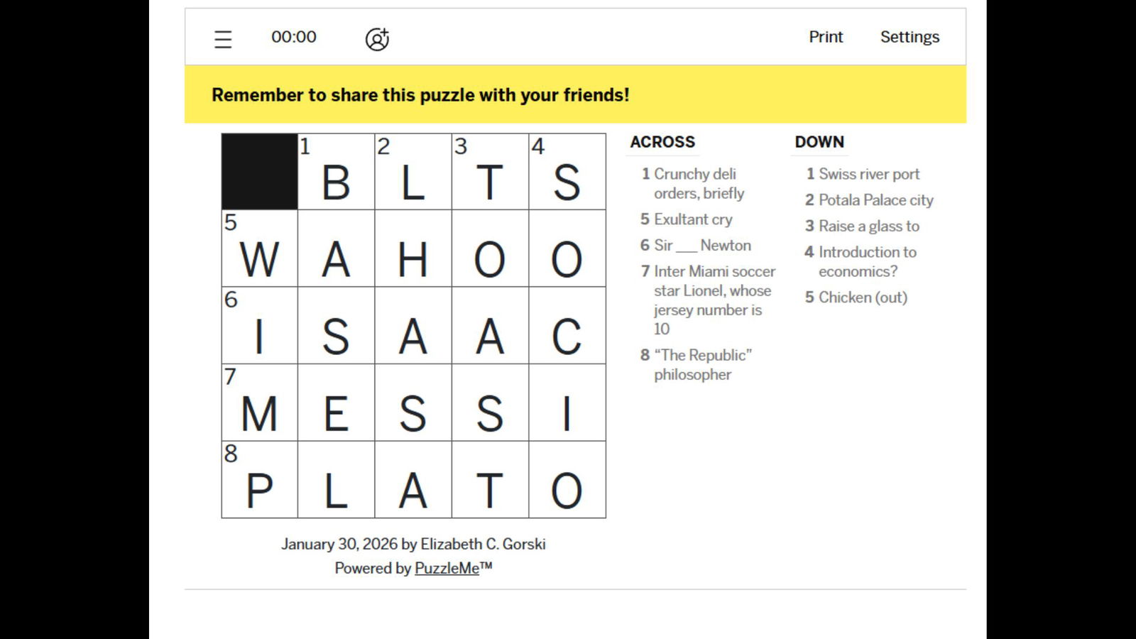Ответы на мини-кроссворд LA Times за 30 января 2026 года.