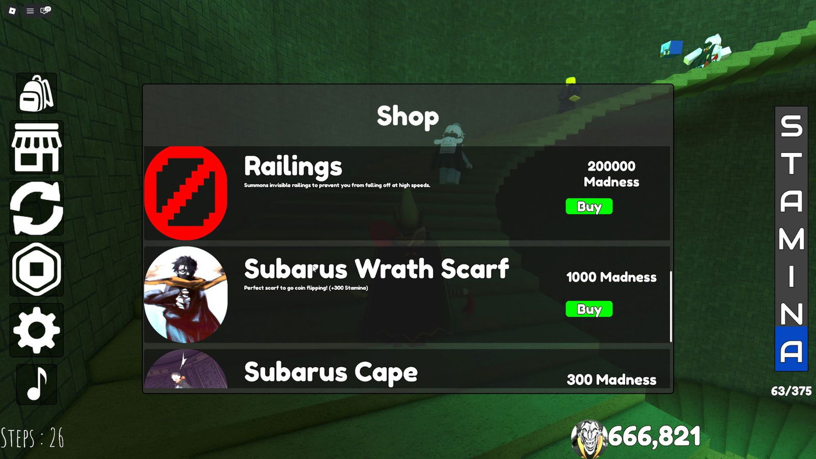 Безумие позволяет вам покупать вещи в магазине, которые могут повысить вашу выносливость и скорость, что значительно облегчает подъем по лестнице. Без использования специальных кодов потребуется очень много времени, чтобы заработать достаточно средств для покупки этих полезных предметов.