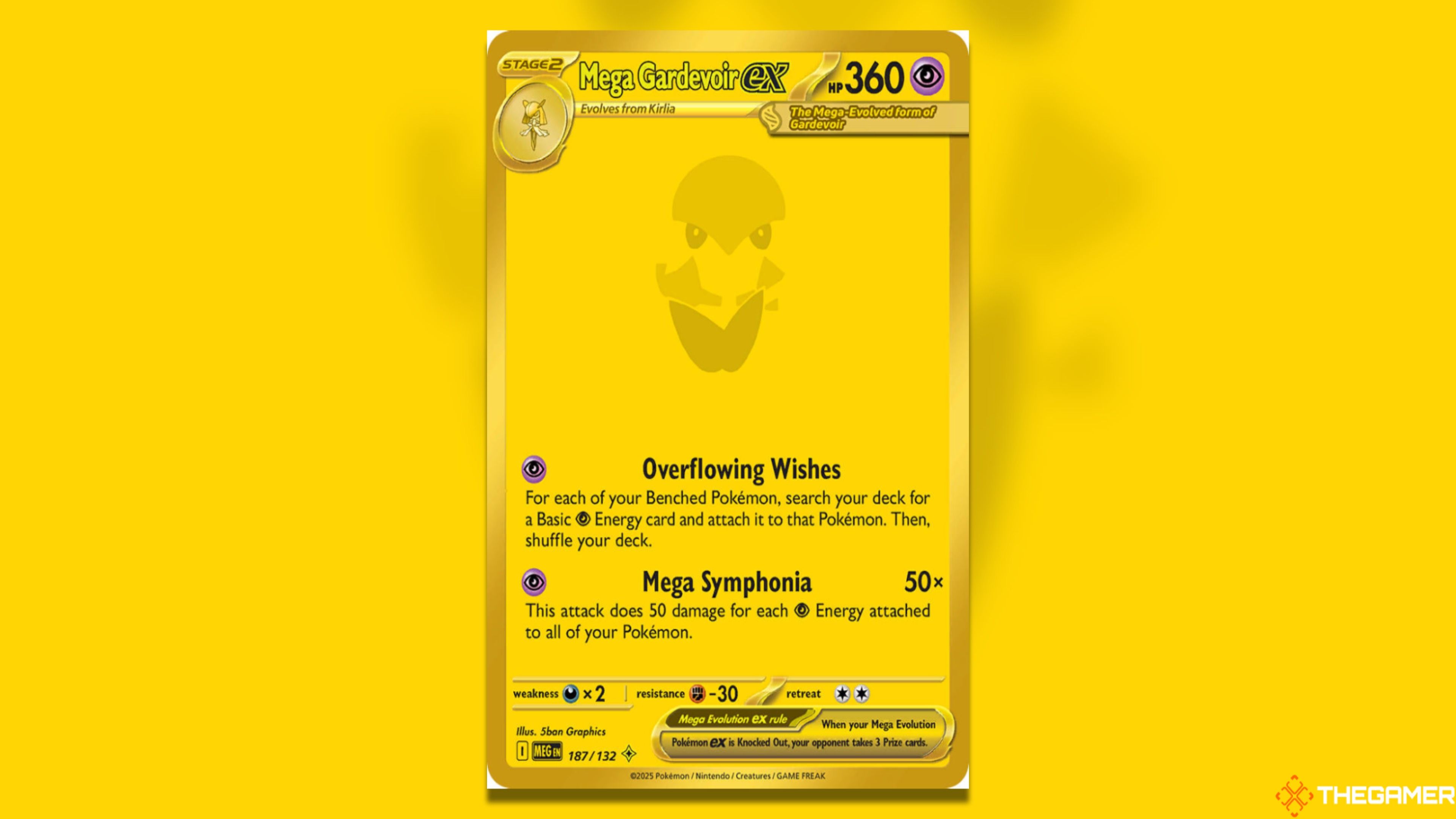 Новейшие карты Mega Hyper Rare демонстрируют покемонов в виде детализированных, выгравированных силуэтов на эффектном золотом фоне. Однако, этот дизайн не подходит для всех покемонов – некоторые, такие как Gardevoir, выглядят немного странно, почти как парящая голова на этой конкретной карте. Несмотря на визуальные проблемы, карта Mega Gardevoir довольно ценная, стоит более 300 долларов и входит в число самых дорогих карт в наборе.