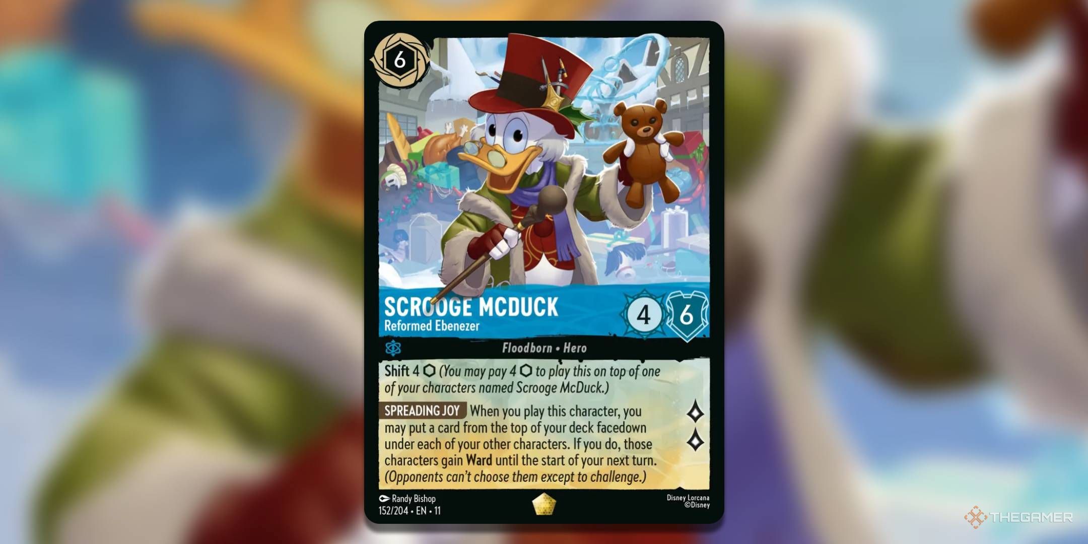 Скрудж Макдак, Раскаявшийся Эбенезер — сильная карта, которую вы можете разыграть примерно на 4-м ходу, предлагающая надежную статистику 4/6. Его способность, Распространение Радости, позволяет вам поместить карту под каждую карту с Усилением, по сути давая вам бесплатные Усиления, не используя чернила. Кроме того, у Скруджа также есть Защита, что делает его более устойчивым. В целом, это очень эффективная карта для использования.