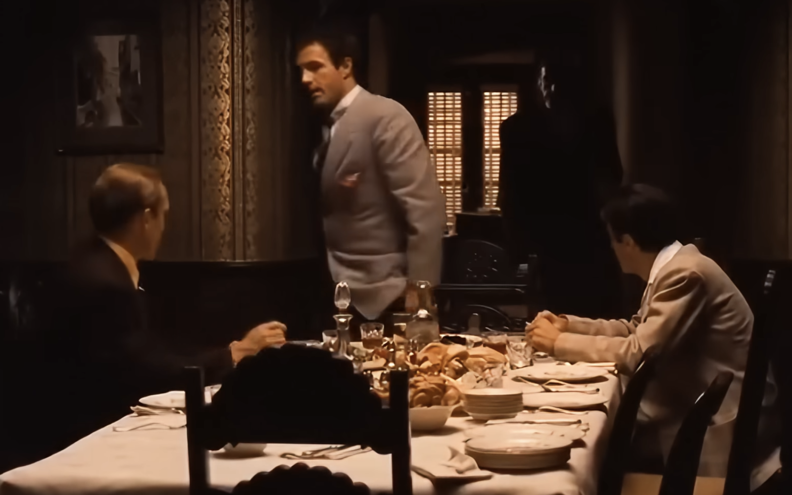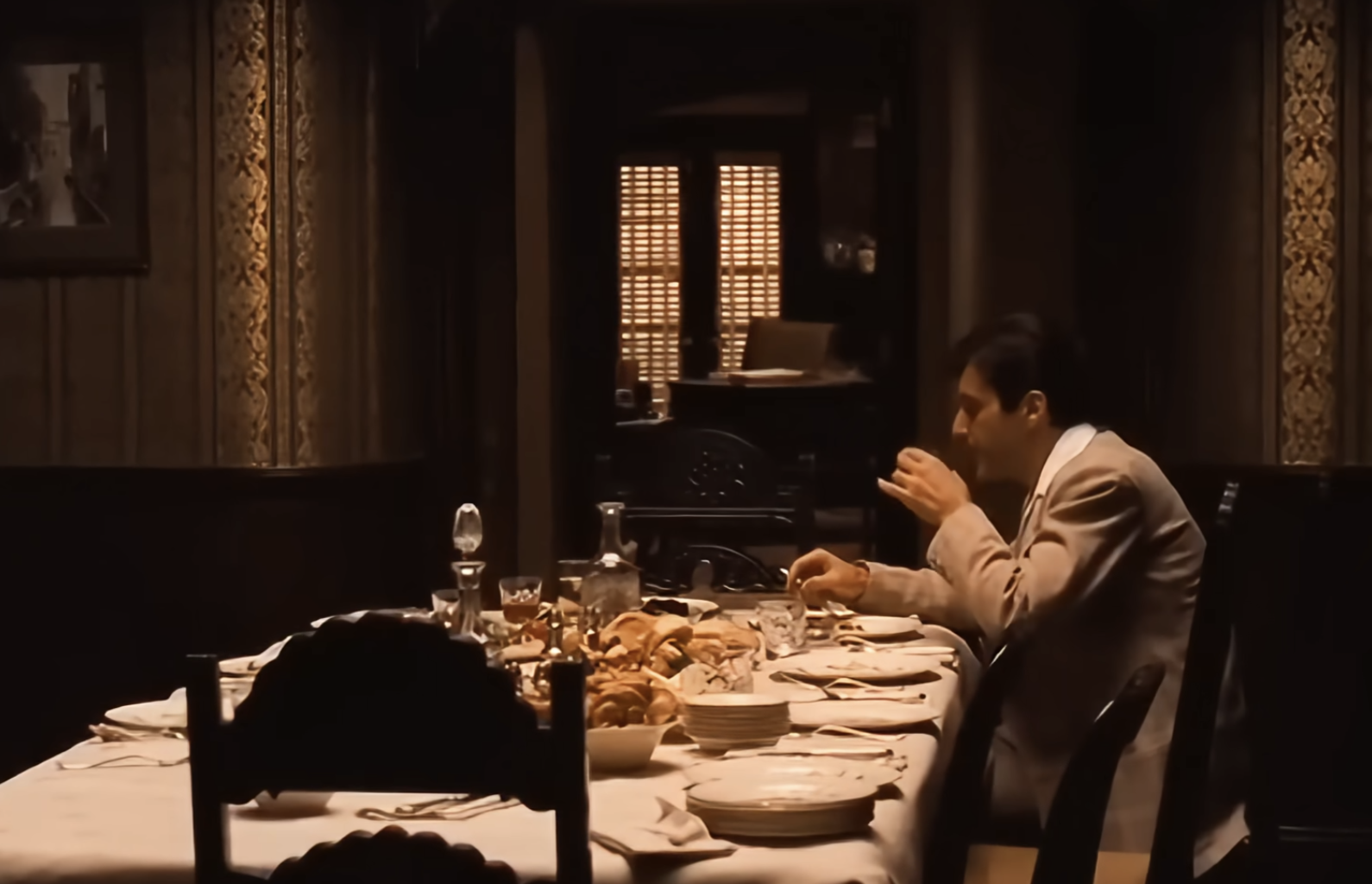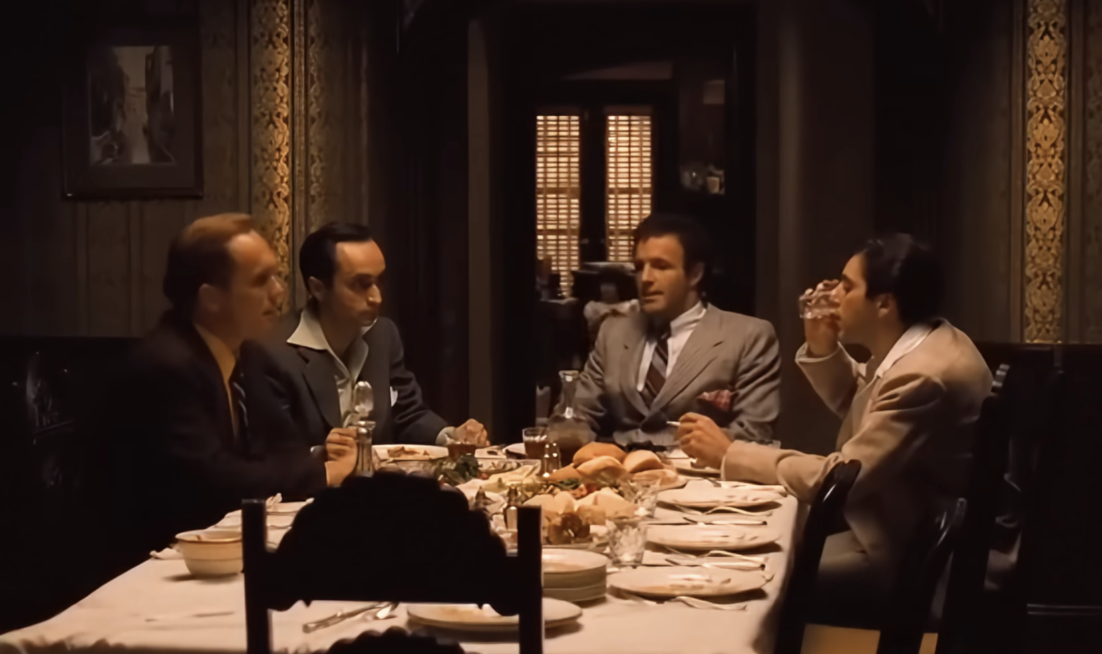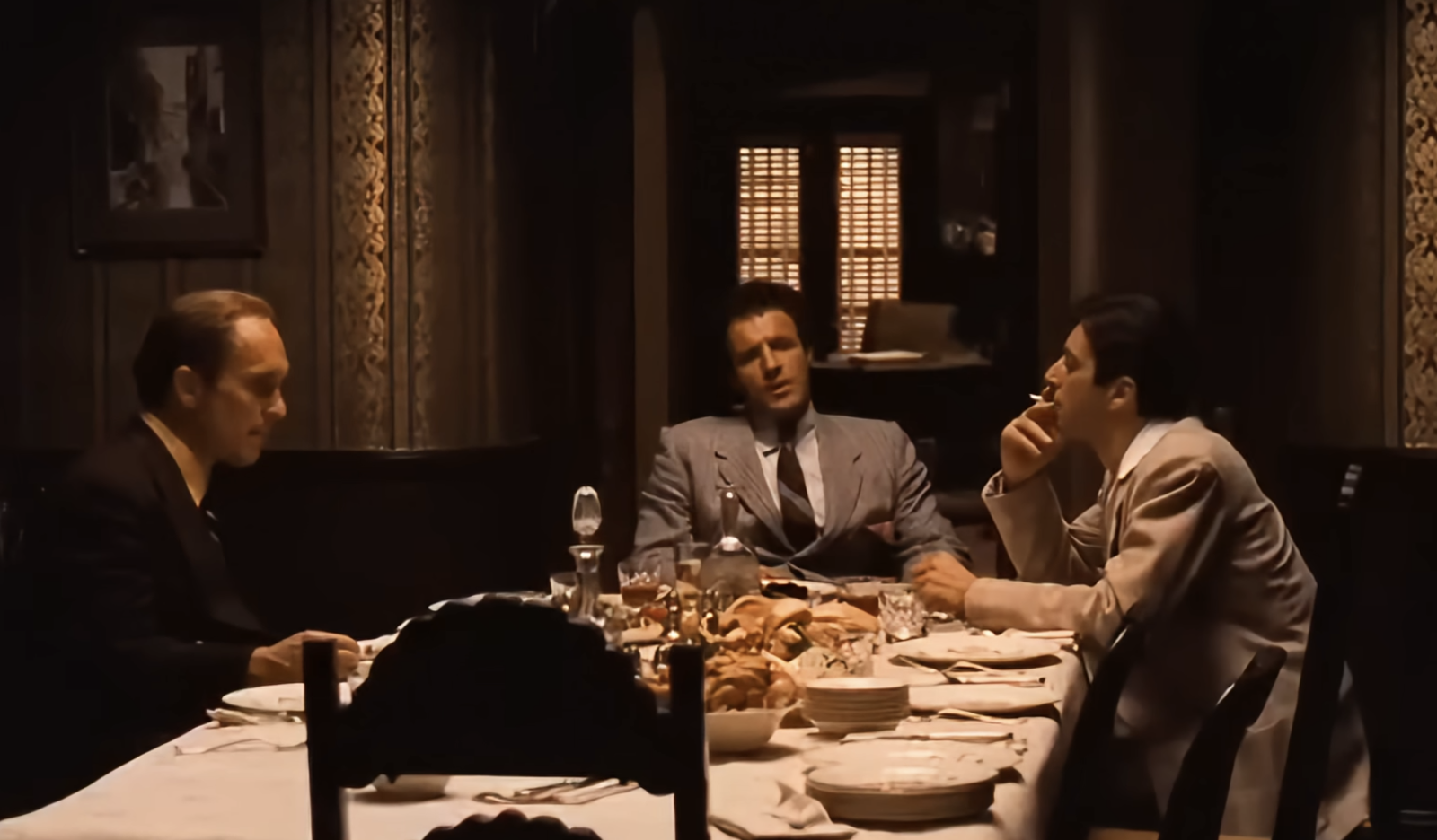 Я всегда был поражён сценой за обеденным столом в The Godfather Part II. Она настолько мощная, особенно зная, что это флэшбэк, происходящий прямо в пик напряжения фильма. Вы видите всех братьев и сестёр Корлеоне и Тома Хагена вместе, притворяющихся нормальными, пока тайно ждут своего отца, Вито. Но настоящий удар в живот приходит, когда Майкл вдруг объявляет, что вступает в морскую пехоту – это полный шок и идёт вразрез со всем, чего его семья хочет для него. Это блестящий момент, который, я думаю, действительно определяет его характер.