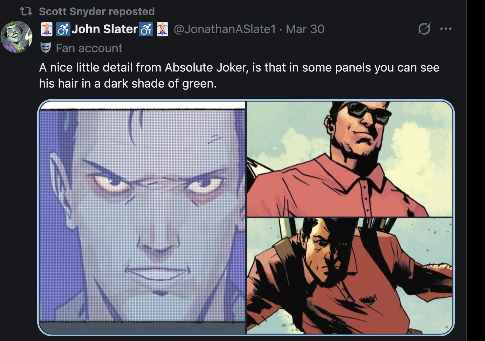 Существует большой ажиотаж вокруг предстоящего выпуска #19 Absolute Batman, и писатель Скотт Снайдер действительно хочет, чтобы фанаты знали об этом. Он активно подогревает интерес в X (ранее Twitter) – @Ssnyder1835 – даже делясь наблюдением фаната о тёмно-зелёном цвете волос Джокера в Absolute Joker.