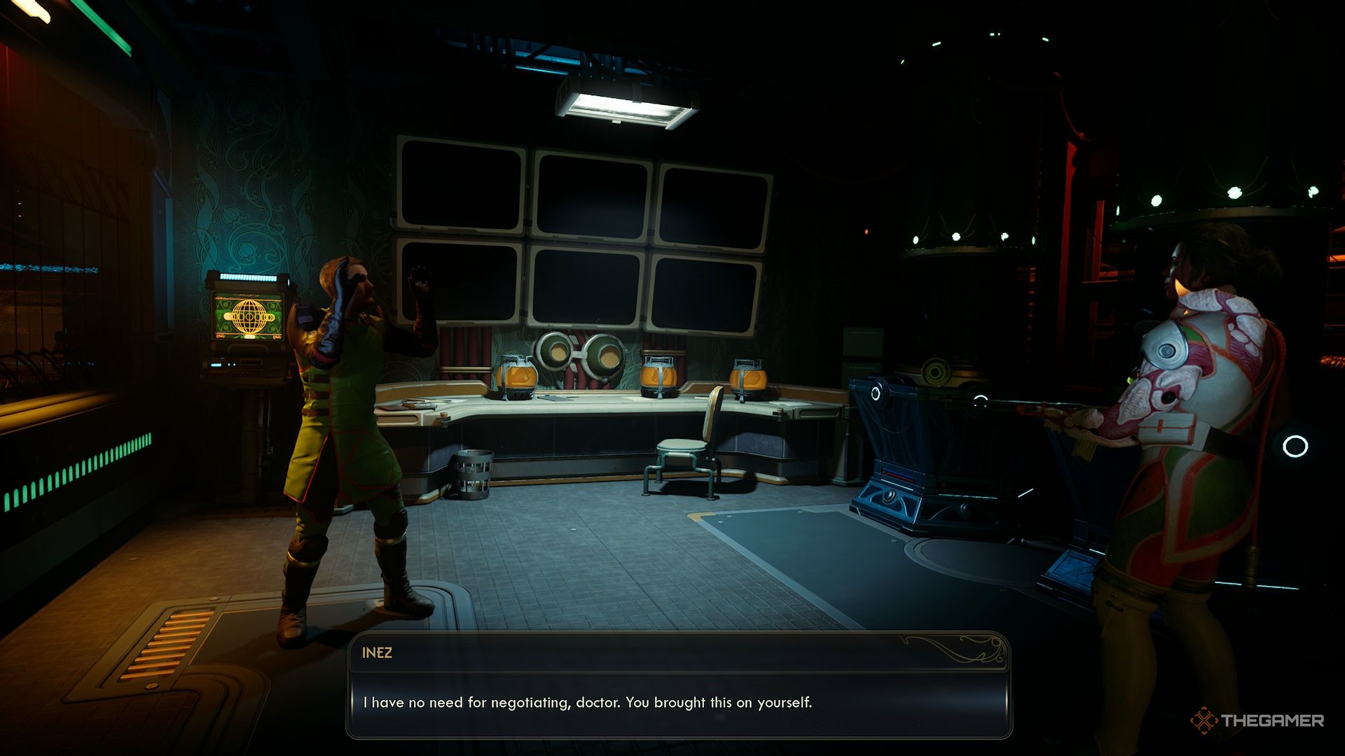 Игра теперь просит вас поговорить с ней, но хорошей идеей будет сначала прочитать терминал в углу комнаты. Он содержит полезную информацию, которую вы можете использовать во время разговора.