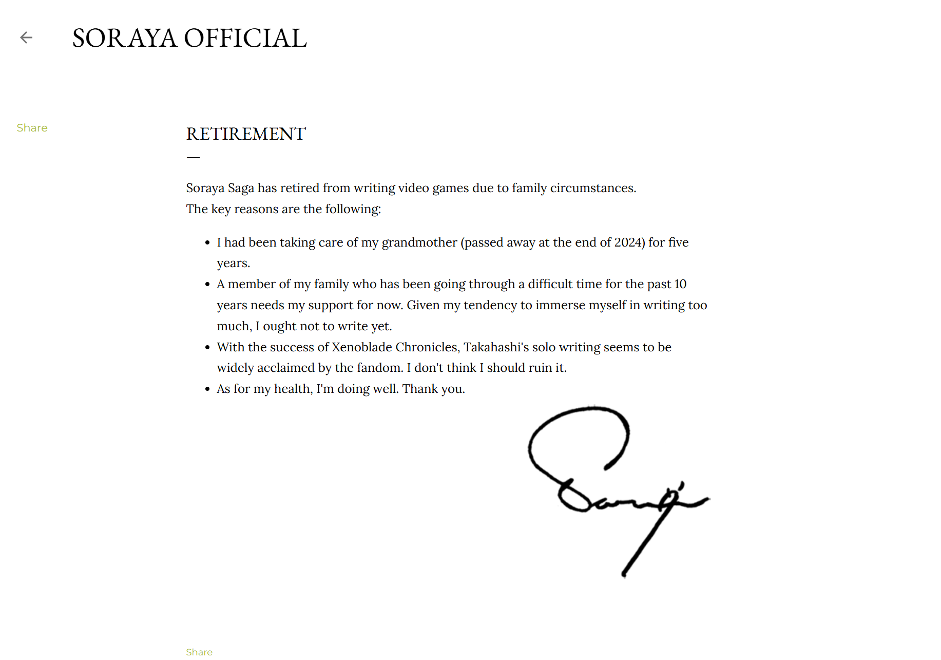 Saga внесла свой вклад в серию Xenoblade только в качестве приглашённого художника в Xenoblade Chronicles 2 – и это не должно умалять её мастерство. С тех пор она публично не участвовала в разработке игр и теперь официально объявила о своём уходе из индустрии написания для игр.