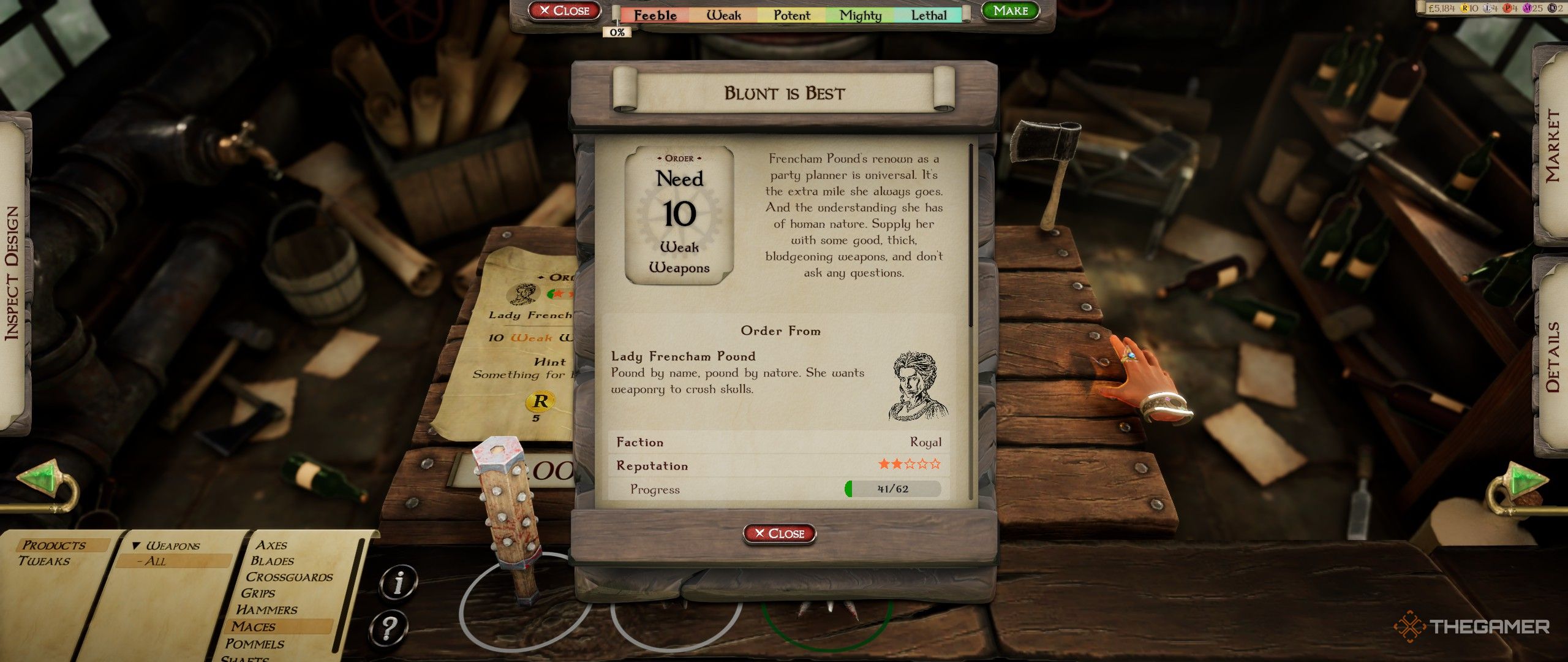 Выполнение заказов – основной способ заработка в игре. Крайне важно тщательно выполнять конкретные запросы каждого клиента. Заказы обычно начинаются с общей идеи – например, оружейник может попросить ‘Что-нибудь для сокрушения’, оставляя вам возможность разобраться в деталях.