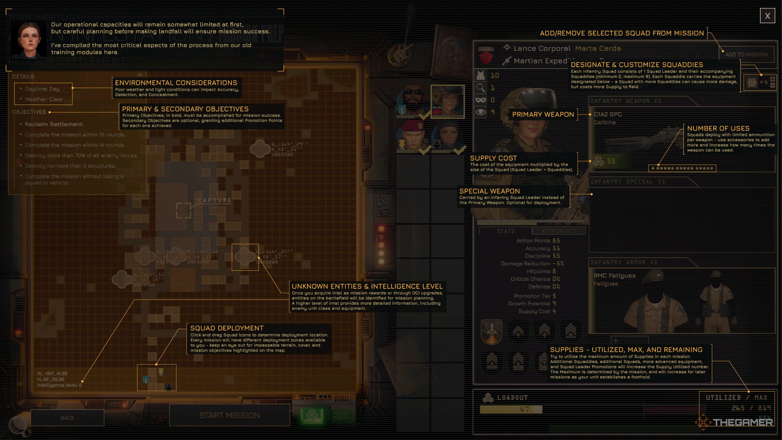 У каждой миссии есть ограничение на количество переносимого снаряжения. Каждый предмет, который вы берете с собой, использует часть этого лимита. Кроме того, офицеры более высокого ранга автоматически занимают больше ресурсов, а количество солдат, которых вы берете с каждым офицером, увеличивает общий лимит ресурсов для миссии.