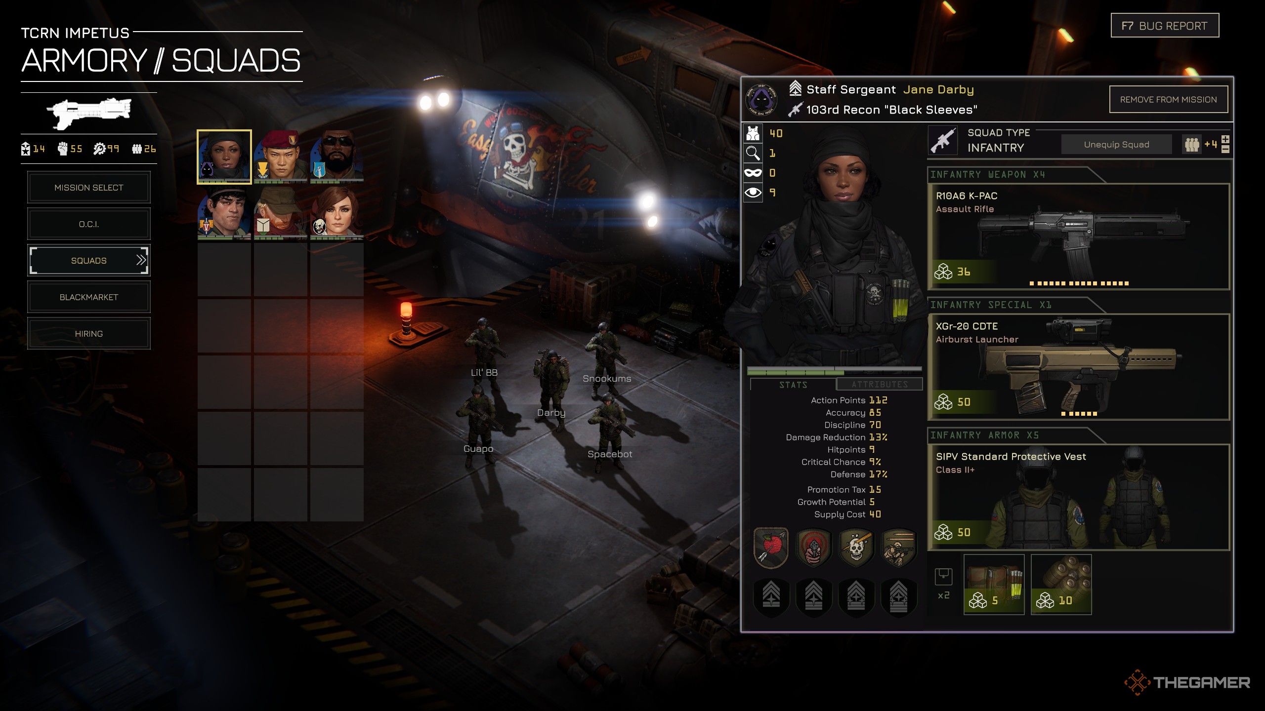 Ваши члены отряда, или ‘Солдаты’, ограничены в количестве. Хотя они медленно восстанавливаются со временем, и вы можете нанять больше на чёрном рынке, это очень дорого. Поэтому будьте осторожны и не подвергайте свои отряды ненужным рискам во время миссий, потому что, хотя их здоровье восстанавливается между миссиями, вы можете их не вернуть, если они будут потеряны.