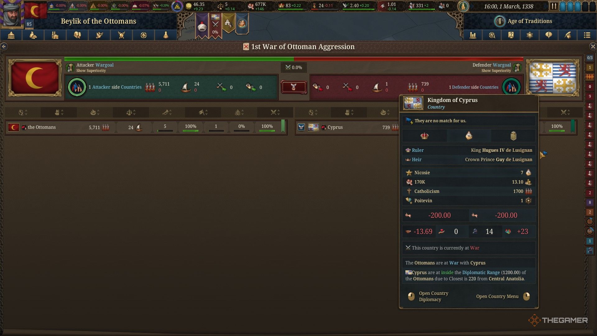 Возможно автоматически успешно выполнить задание ‘Превзойти своих врагов’ в зависимости от выбранной начальной страны и того, кого вы выберете в качестве соперника. Например, мы начали за Османскую империю и назначили Кипр нашим соперником. Кипр уже значительно уступал нам по силе на старте задания, что означало, что нам даже не нужно было воевать, чтобы добиться победы.