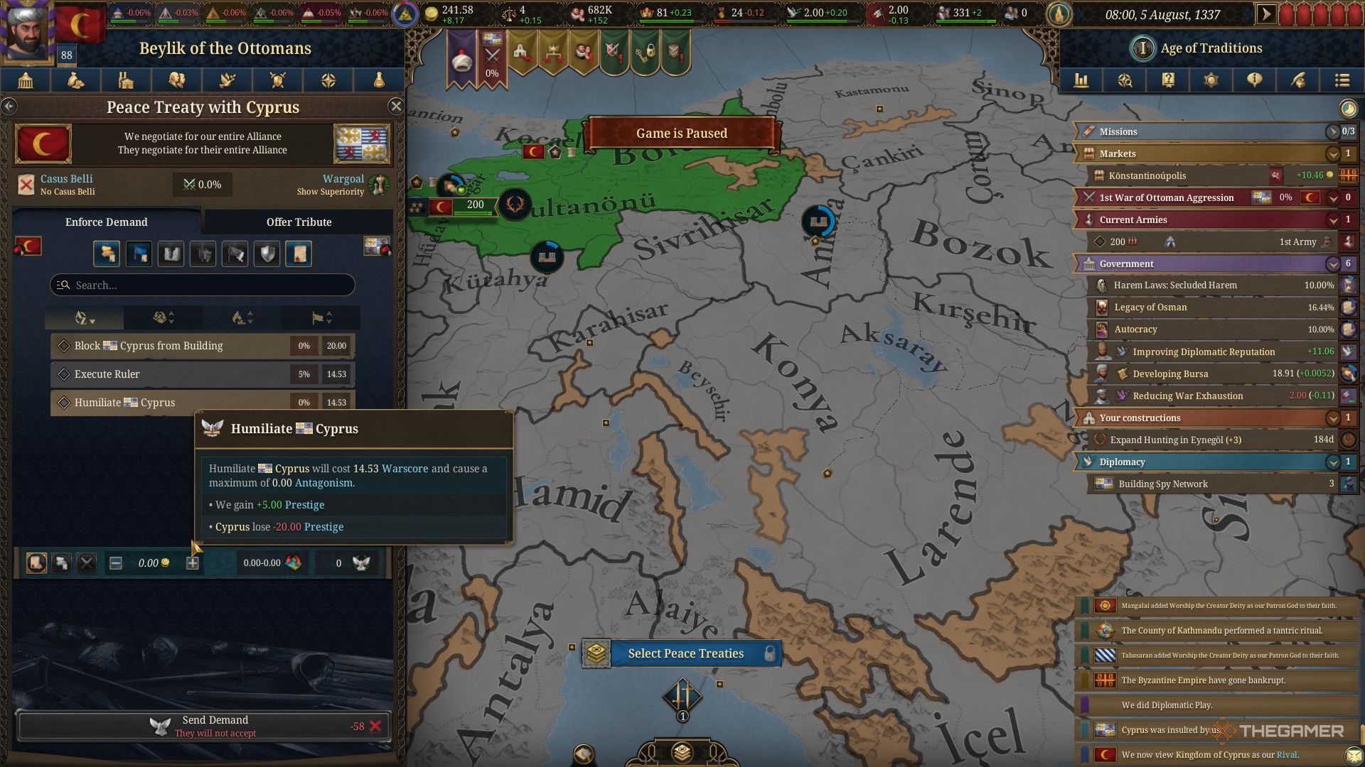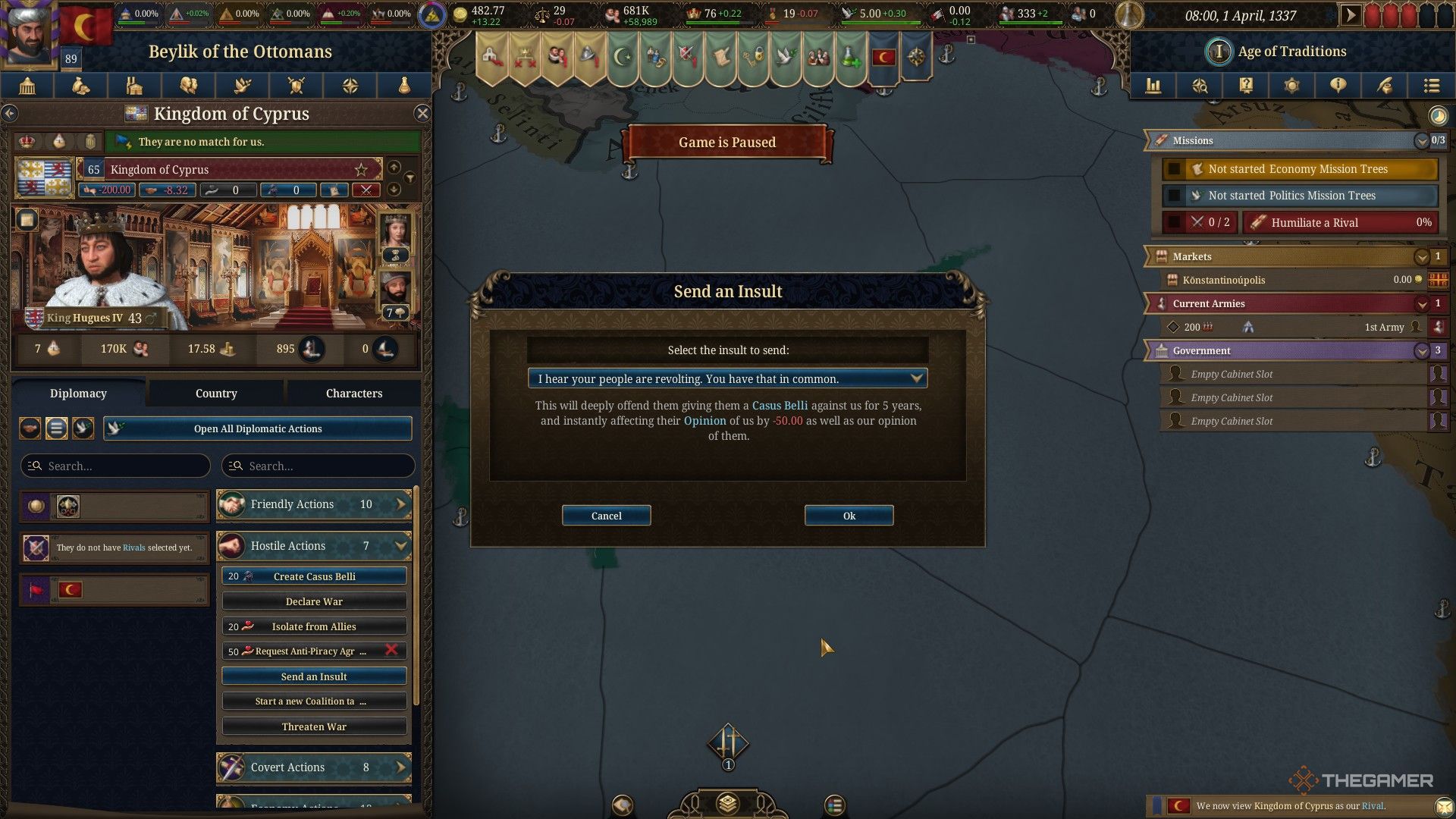 Возможно автоматически успешно выполнить задание ‘Превзойти своих врагов’ в зависимости от выбранной начальной страны и того, кого вы выберете в качестве соперника. Например, мы начали за Османскую империю и назначили Кипр нашим соперником. Кипр уже значительно уступал нам по силе на старте задания, что означало, что нам даже не нужно было воевать, чтобы добиться победы.