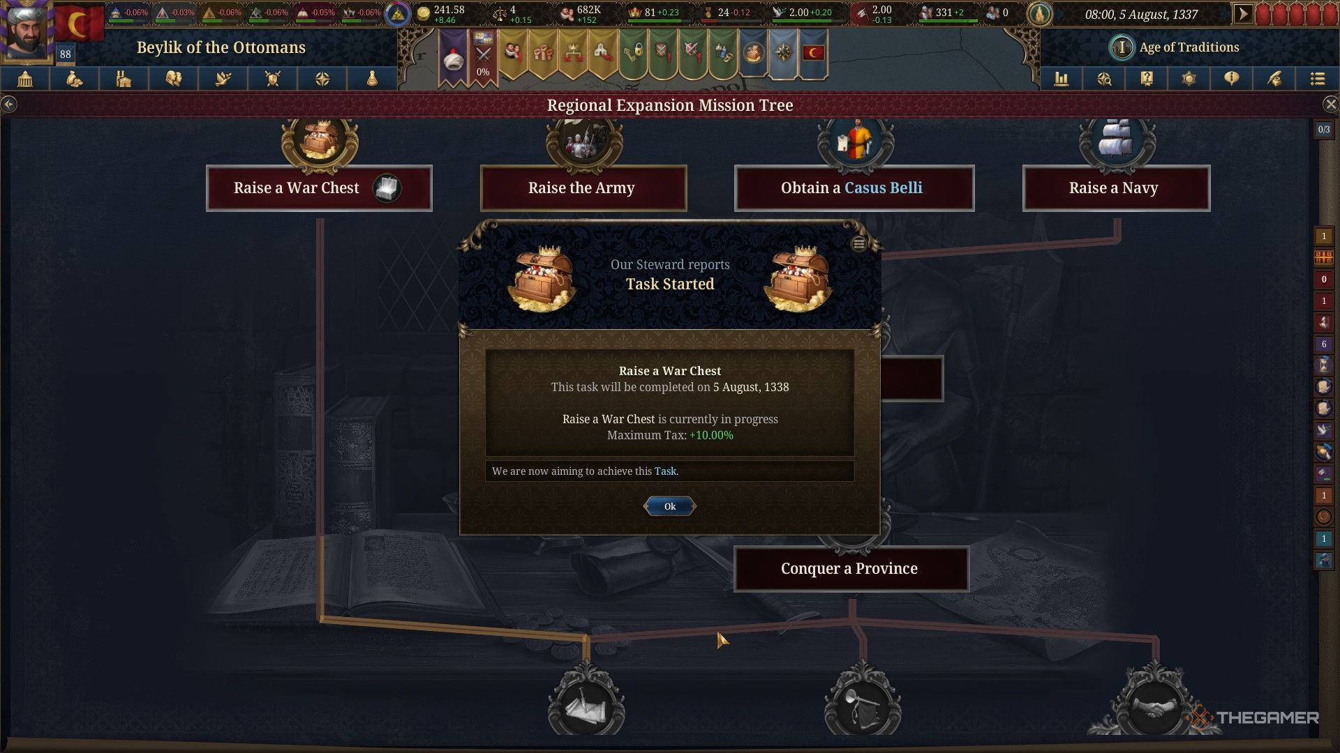 Сначала сосредоточьтесь на накоплении средств – это называется ‘Raising a War Chest’ и покроет расходы на предстоящие сражения. Как только это будет сделано, вам нужно будет выполнить еще три задачи, прежде чем вы сможете начать сражаться.