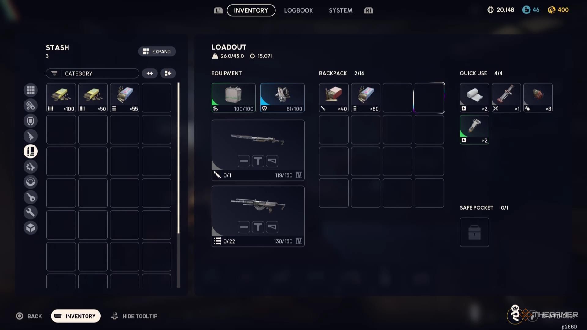 Вам, вероятно, придётся путешествовать налегке, если вы не несёте с собой много снаряжения. Однако, вам абсолютно необходимы перезарядчики щита и бинты, а также либо одно универсальное оружие, либо пара специализированных. Иметь под рукой немного взрывчатки также было бы неплохой идеей.