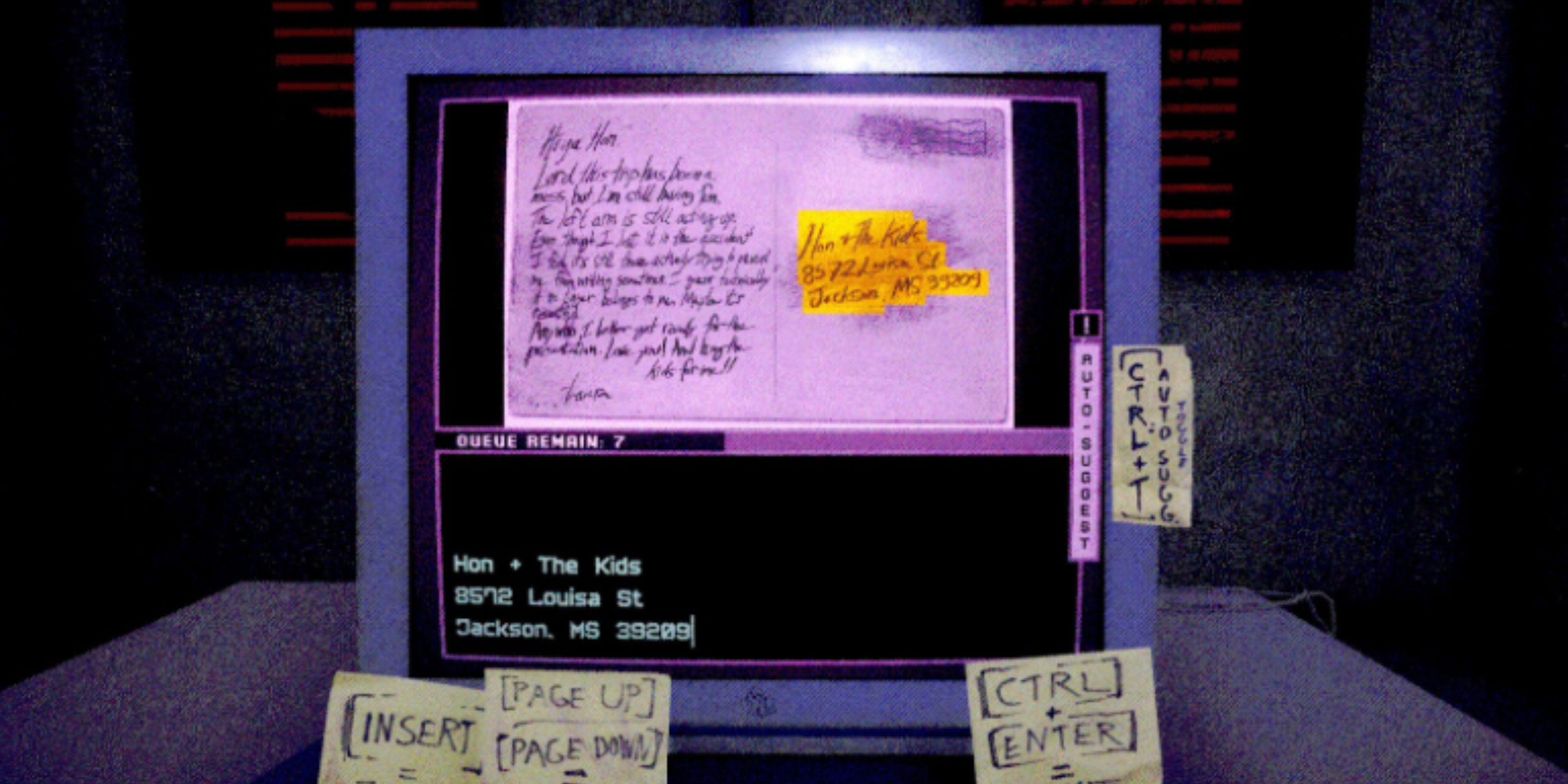 Вы работаете в отделе невозвратной корреспонденции, пытаясь определить, куда следует направить недоставленную почту, читая неразборчивый почерк и ища подсказки в контексте. Но по мере того, как проходит ваша смена, вы чувствуете, что происходит что-то зловещее. Вы начинаете получать почту с тревожными описаниями жестоких смертей или конверты, покрытые все более странными и хаотичными надписями. Все это приводит к ужасающему кульминационному моменту, который останется с вами надолго после того, как вы уйдете с работы.