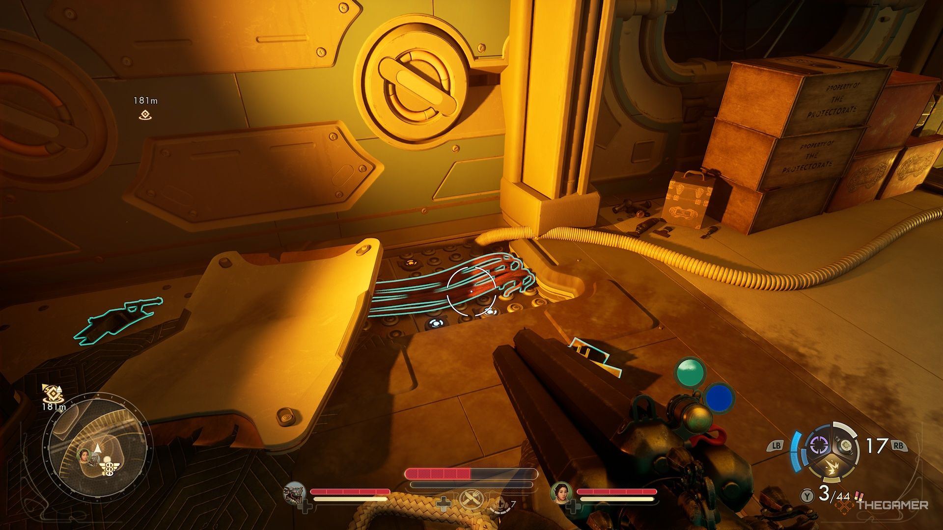 Как только вы выйдете из лифта, поищите Инициата Даблдей. Она предложит вам побочное задание, но оно не связано с тем, что вы сейчас делаете. Далее поднимитесь по лестнице рядом с ней, а затем по лестнице слева от вас. Наверху вы найдёте область, заполненную газом.