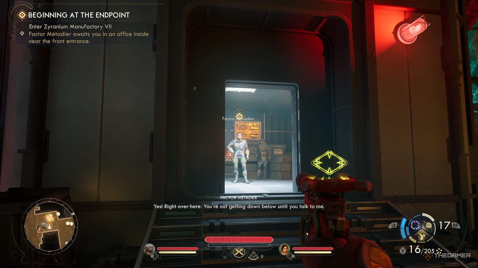 Как только вы окажетесь внутри, найдите Factor Metadier в небольшой комнате сразу слева от вас. Покажите ему свою Writ of Investigatory – этого достаточно, чтобы получить разрешение на использование лифта. Вы также можете пообщаться с ним, чтобы узнать, что происходит.