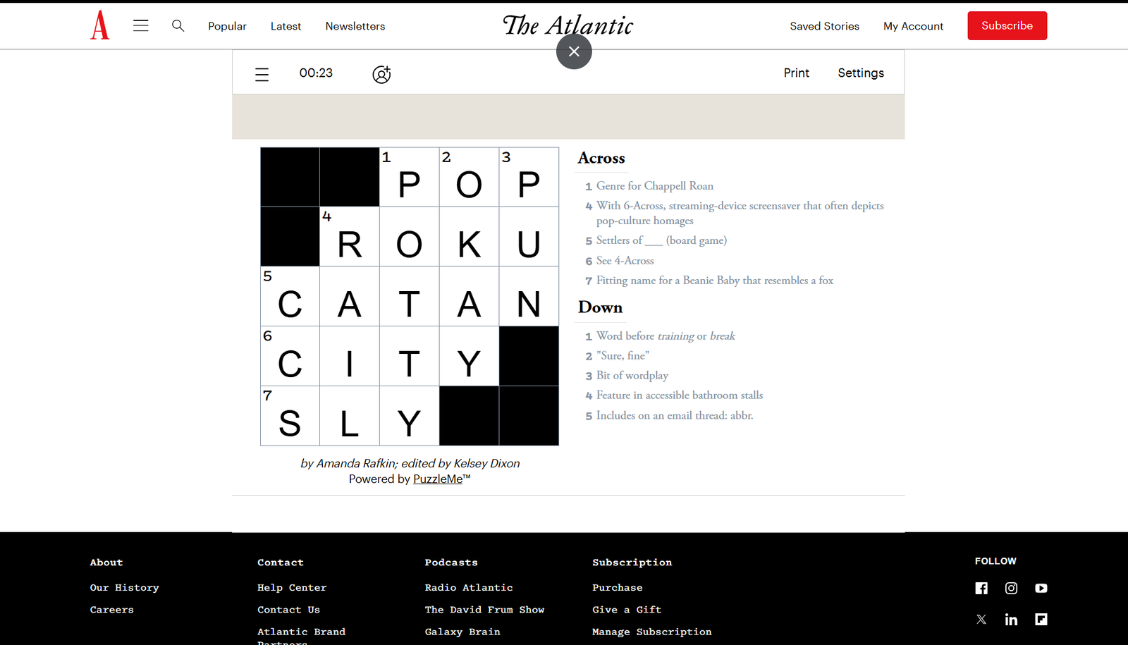 Вот ответы на подсказки: 1. Жанр музыки Chappell Roan — POP. 4 & 6. Обои экрана на стриминговых устройствах, таких как Roku, часто содержат отсылки к поп-культуре, и это устройство — Roku City. 5. Настольная игра Settlers of Catan просто известна как CATAN. 7. Игрушка Beanie Baby, разработанная как лиса, имеет подходящее имя SLY.