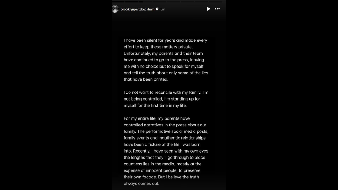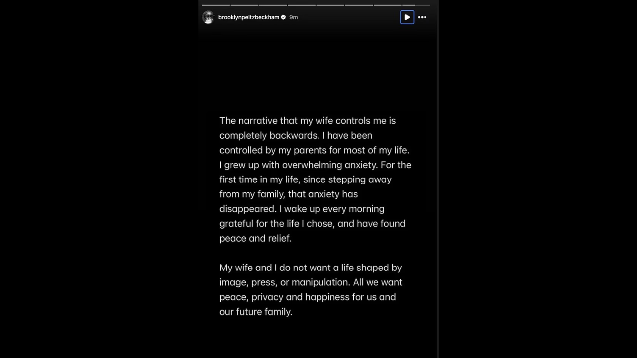 Бруклин Бекхэм высказался о семейных проблемах, подтвердив давние слухи о напряженности. В длинном заявлении, опубликованном в сети, он объяснил, что некоторое время хранил молчание о личных делах, но почувствовал, что у него не осталось другого выбора после того, как его родители и их представители неоднократно разговаривали со СМИ. Он заявил: