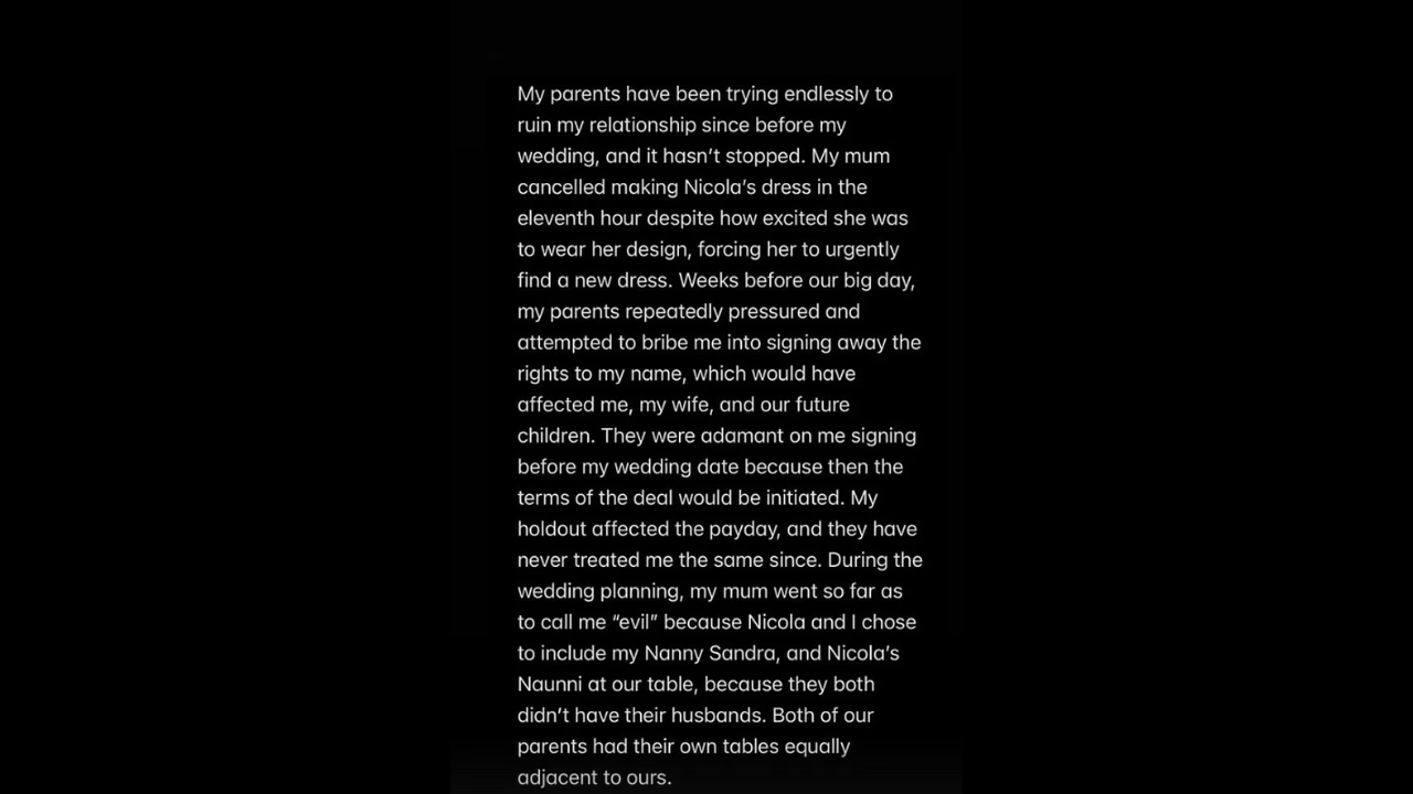 Он объяснил, что его родители отреагировали по-разному после того, как он решил не подписывать соглашение. Он также рассказал, что Виктория назвала его ‘злым’ за то, что он пригласил на их свадьбу обеих их нянь. Перед свадьбой члены семьи, по сообщениям, сказали ему, что Никола Пельтц на самом деле не является частью семьи, заявив, что она не ‘родня’ и не ‘семья’.