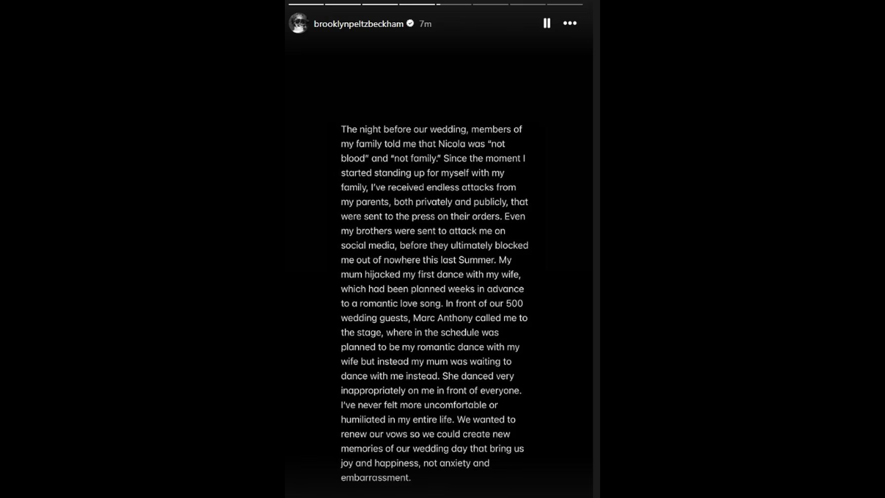 После слухов о танцах Виктории Бекхэм на его свадьбе, Бруклин Бекхэм опубликовал трогательный пост о своей жене в Instagram. Он назвал Никола Пельтц своим «всем миром» и написал: «Я всегда выбираю тебя, малыш. Ты самый удивительный человек, которого я знаю, и это мы с тобой навсегда.»