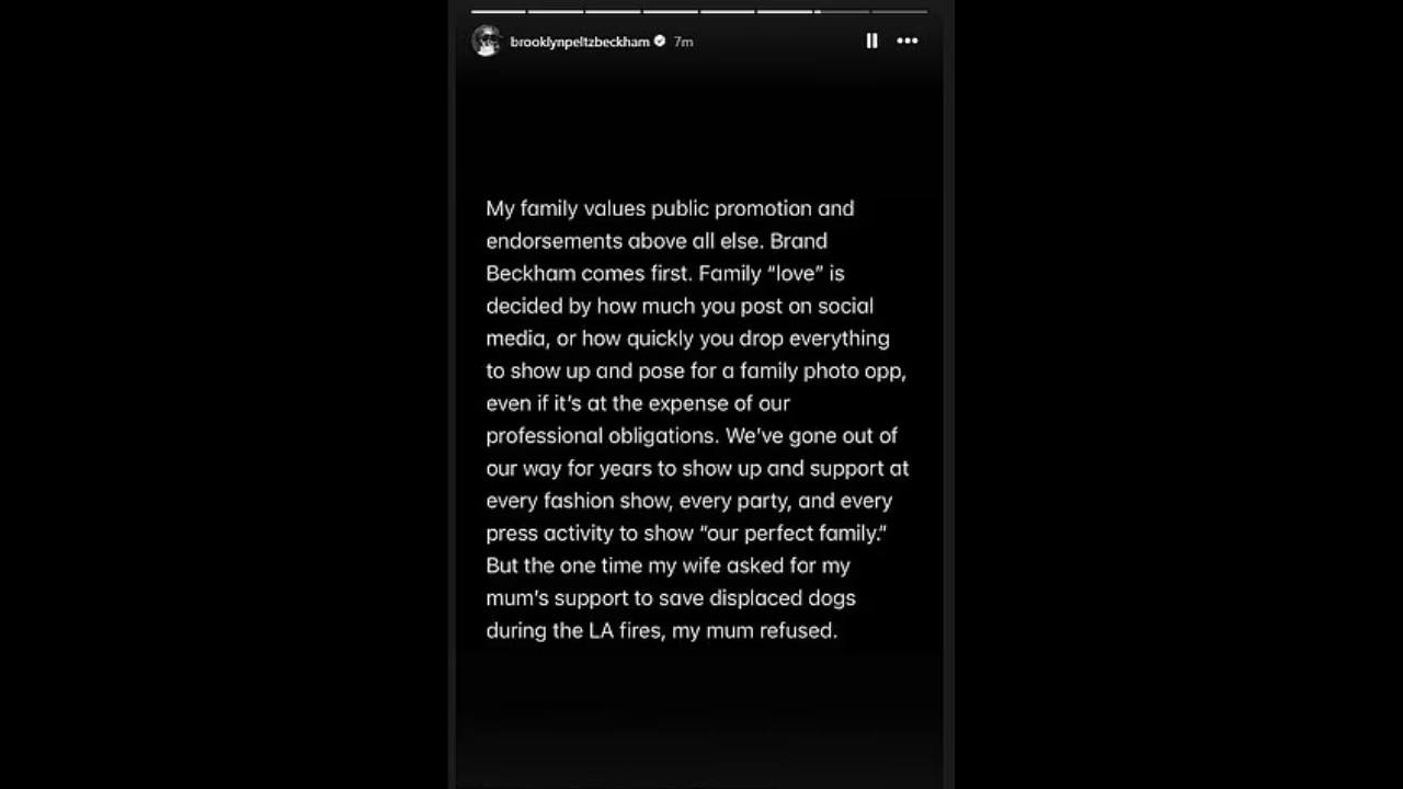 В 2025 году распространились слухи о том, что Дэвид и Виктория Бекхэм заблокировали своего сына, Бруклина, в социальных сетях. Люди заметили, что они не подписаны на него в Instagram, но Крус Бекхэм быстро прояснил, что его родители не виноваты. Он опубликовал в своих Instagram stories объяснение, что его мама и папа, и даже он сам, проснулись и обнаружили, что их заблокировали, что означает, что кто-то другой совершил это действие (согласно E! News).