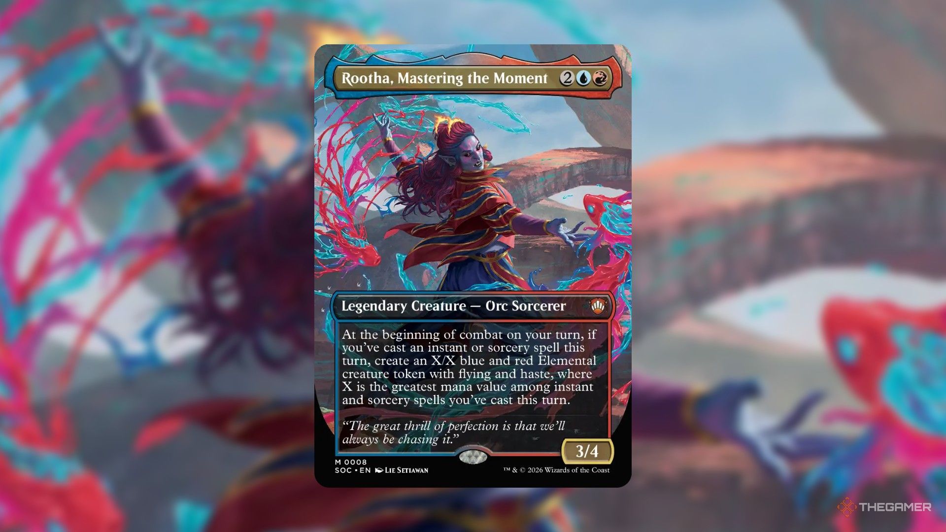 Этот орк-колдун стоит четыре маны и является существом 2/4. В начале каждого вашего хода он создает летающий, поспешный элементальный токен. Сила и выносливость элементаля зависят от самой дорогой мгновенной или заклинательной карты, которую вы разыграли в течение вашей первой основной фазы – если вы не разыграли никаких карт, то элементаль не появляется.