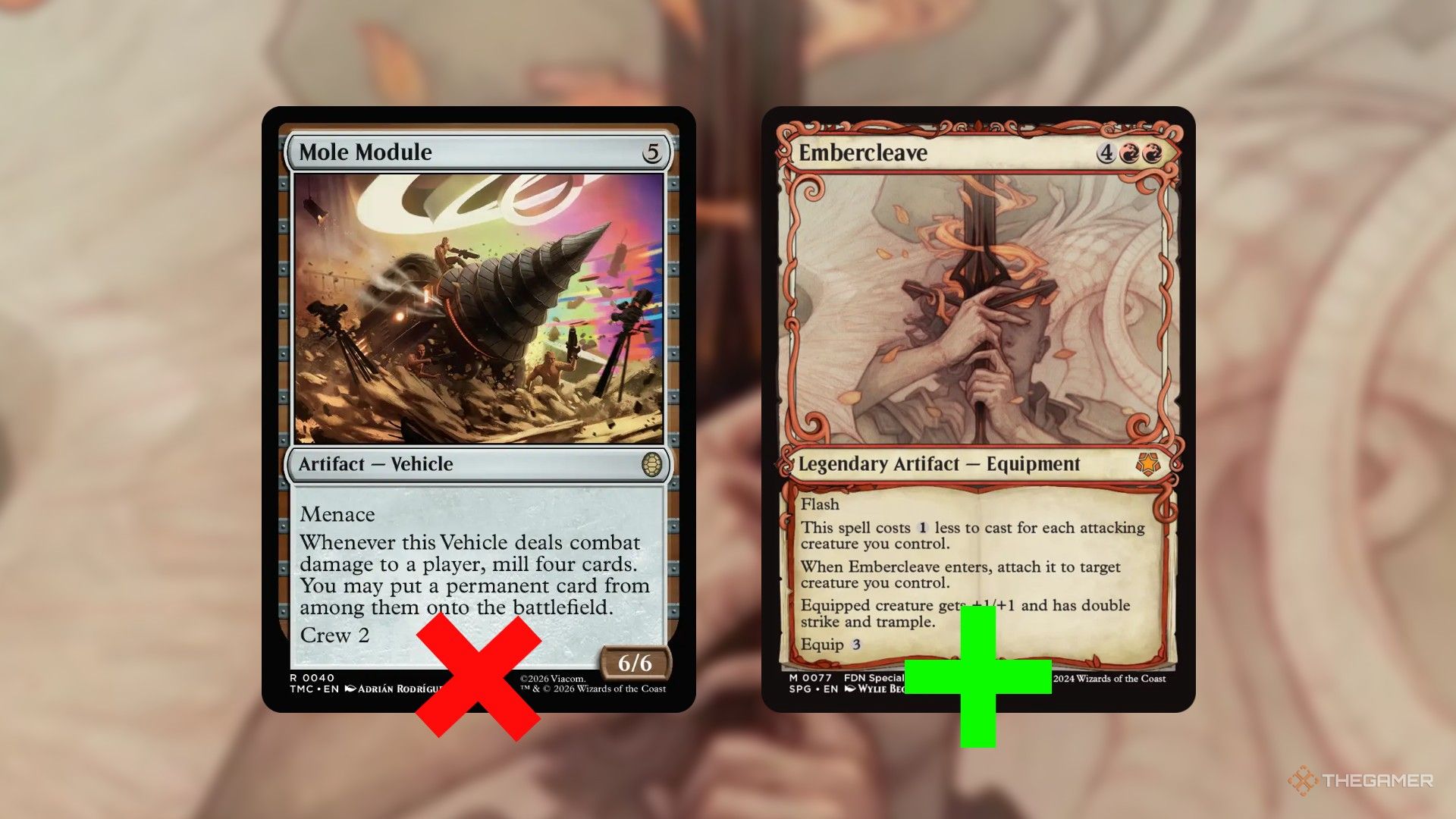 Этот недорогой предмет создает надоедливый летающий токен и позволяет сбросить существо, к которому он прикреплен, в обмен на получение новых карт, когда это существо наносит урон противнику. Однако, он кажется оторванным от остальной части вашей стратегии и не особо вписывается в общую колоду.