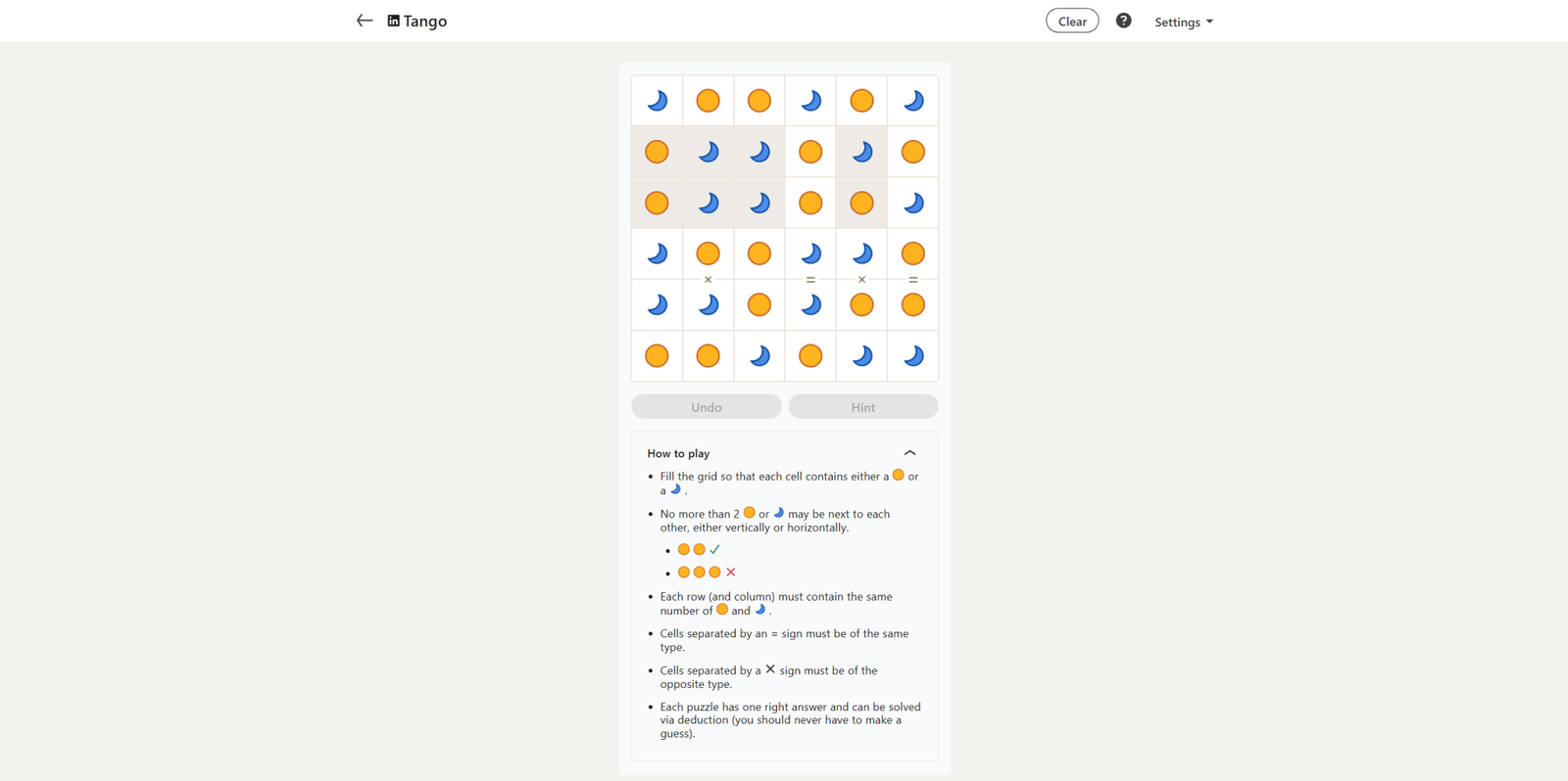 Сегодняшняя головоломка Tango довольно проста, так как начинается с восьми уже заполненных квадратов, которые в значительной степени определяют решение для остальной части сетки.