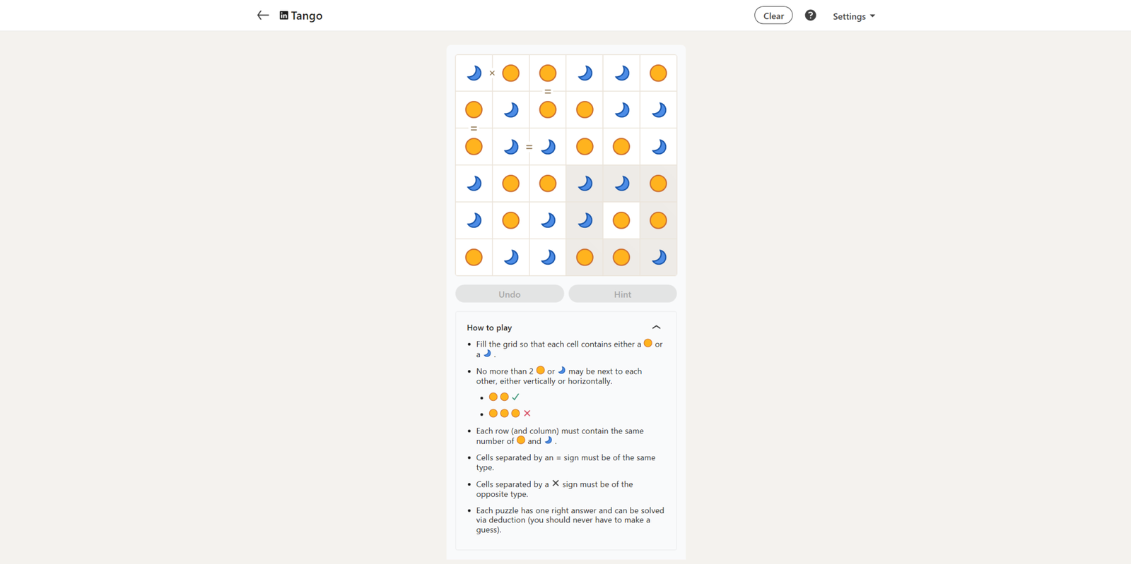 Сегодняшняя головоломка Tango приятна, и она начинается с восьми уже заполненных квадратов. Как только вы начнете, ответы даются довольно легко.