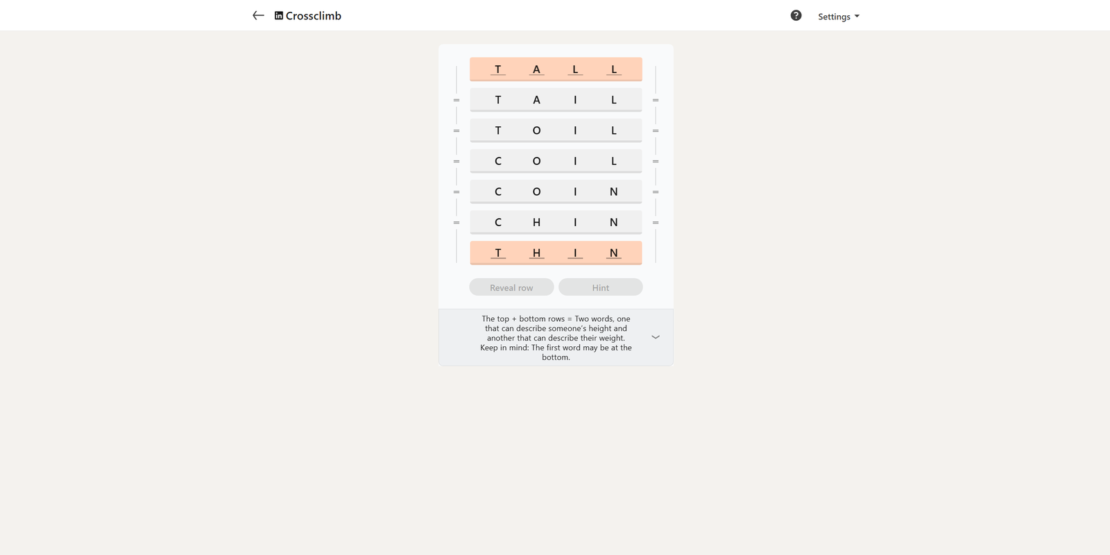 Вот решение для сегодняшнего LinkedIn Crossclimb: