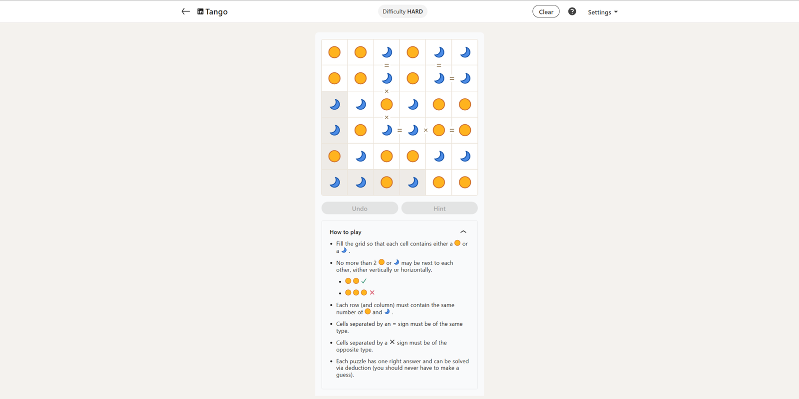 Головоломка Tango на удивление проста на данный момент. Заполнено всего семь квадратов, и одна целая линия уже решена.