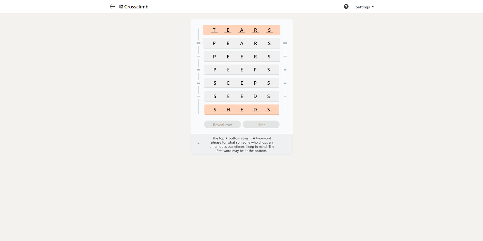 Вот решение для сегодняшнего LinkedIn Crossclimb: