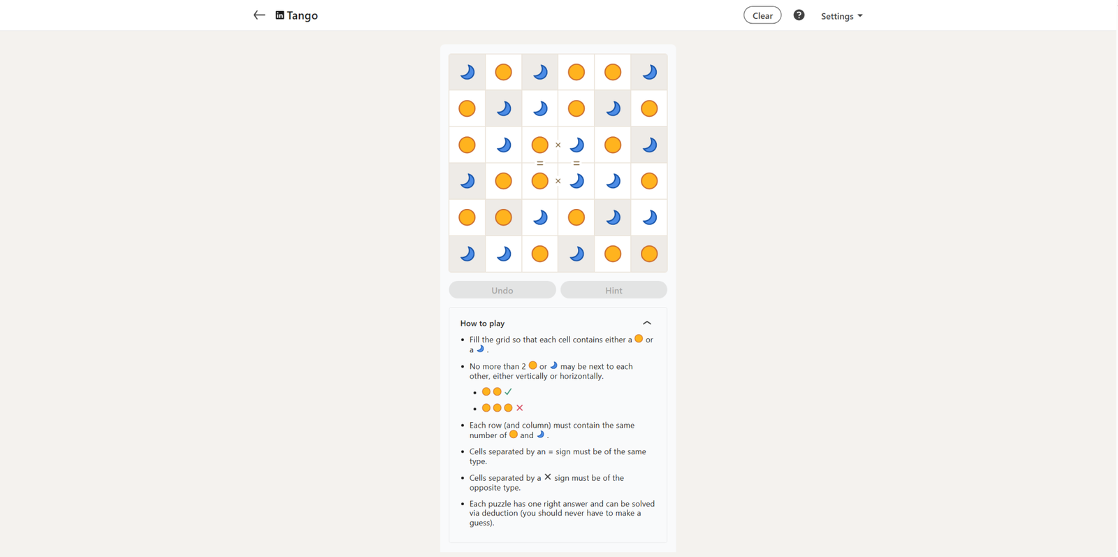 Сегодняшняя головоломка Tango очень легко решается, потому что она начинается с двенадцати уже заполненных квадратов, и многие из них одного типа, что позволяет быстро заполнить оставшуюся сетку.