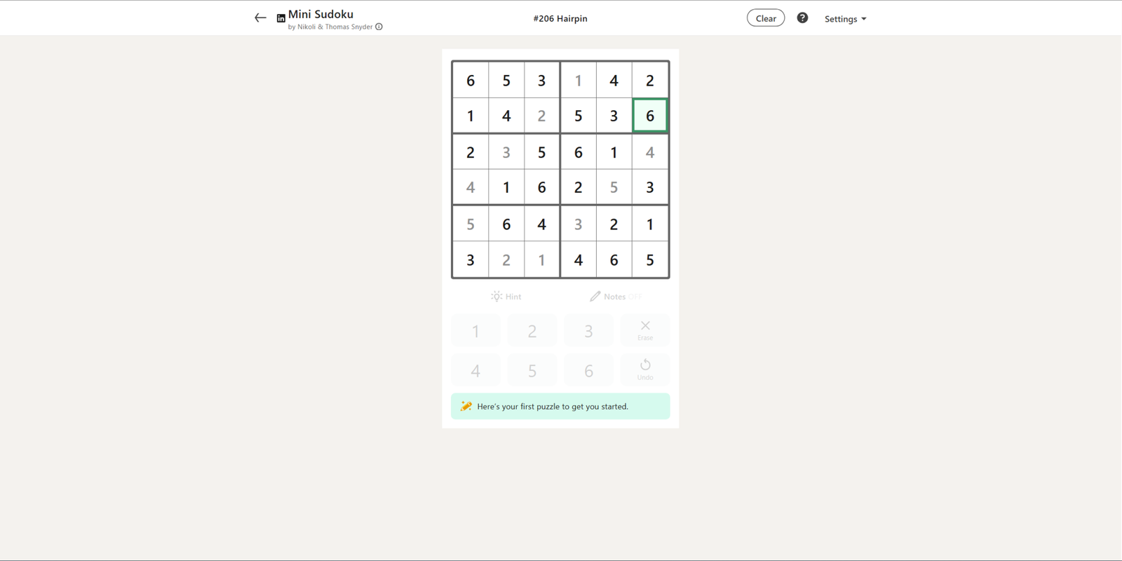 Сегодняшний Мини Судоку имеет тему «Волосатая шпилька» и начинается с десяти уже заполненных чисел. Начальные числа хорошо распределены, и хотя головоломка довольно сложная, ее также очень весело решать.