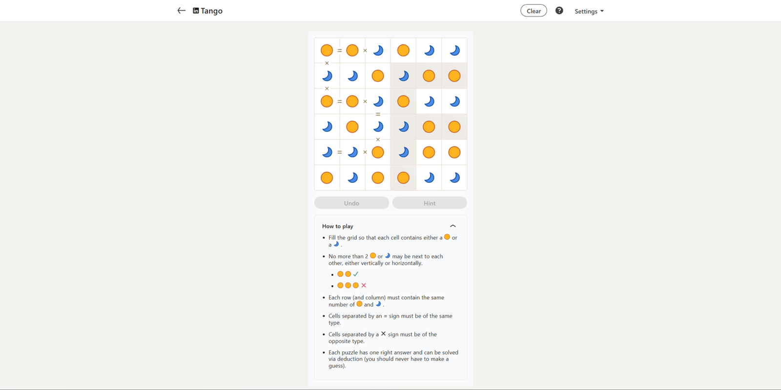 Сегодняшняя головоломка Tango особенно проста. С девятью уже заполненными клетками и хорошим количеством подсказок, её должно быть очень легко решить.