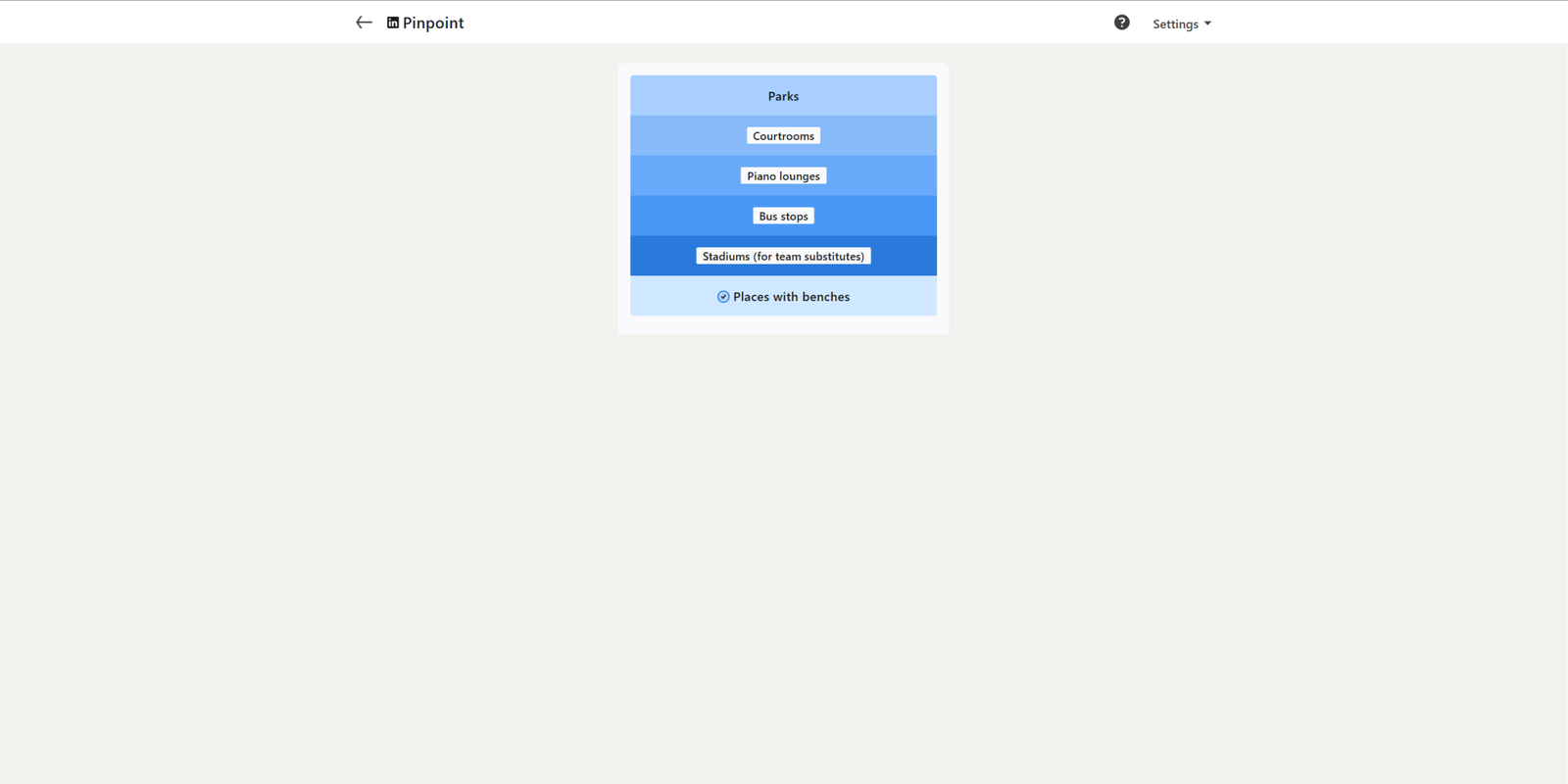 Сегодняшняя головоломка Pinpoint оказалась на удивление легкой – я решил ее с первой попытки! Первая подсказка была ‘Parks’, которая дала мне хорошее начало, а вторая подсказка, ‘Courtrooms’, сделала ответ гораздо более очевидным.