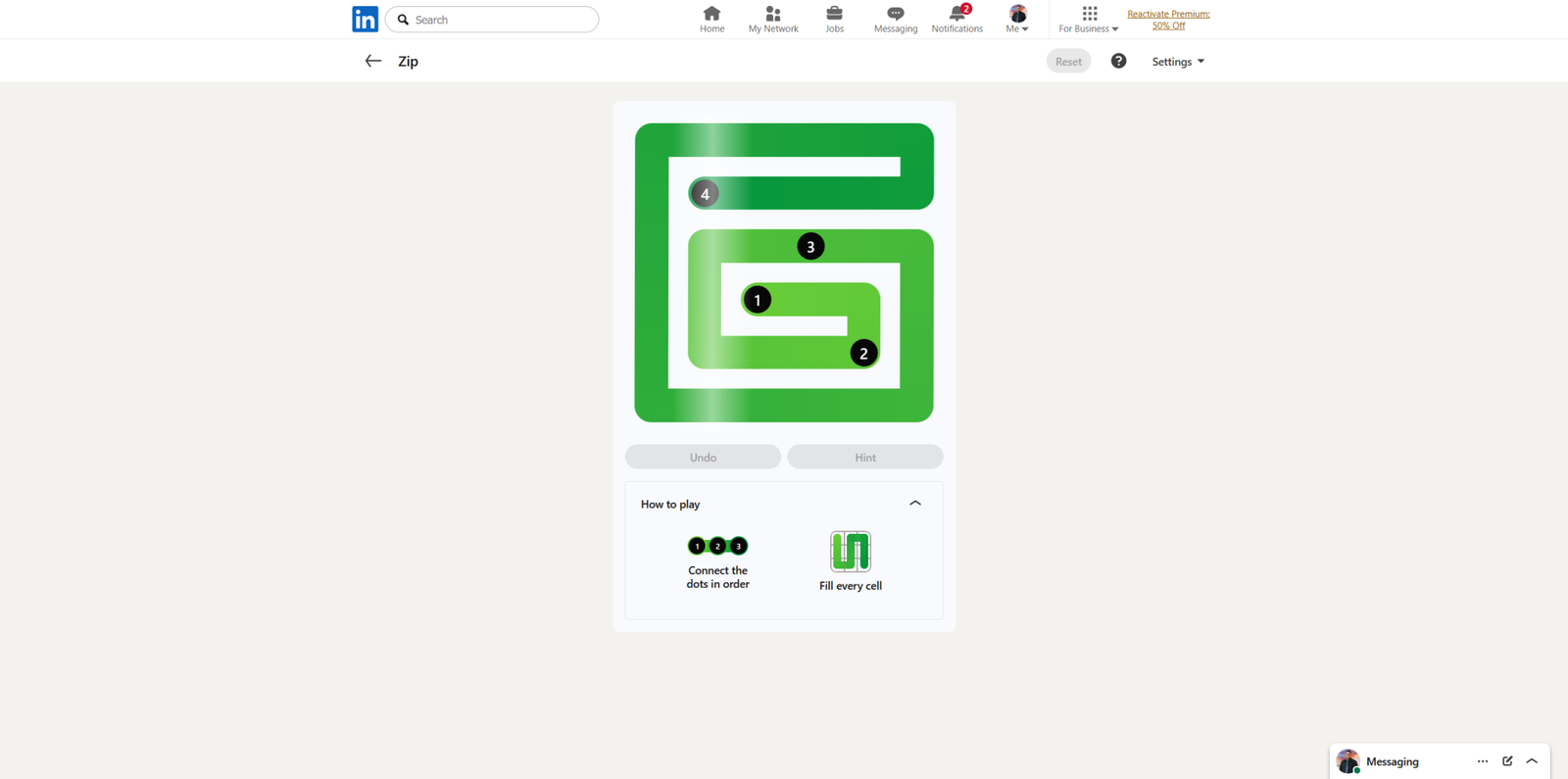 Головоломка Zip достаточно проста. Начните с того, что дважды пройдите налево, затем один раз вниз, чтобы достичь точки 2. Далее, пройдите три раза налево, два раза вверх и направо до края, проходя через точку 3. Продолжайте вниз до самого низа, налево до края, а затем вверх до самого верха. Снова пройдите направо до края, один раз вниз и, наконец, четыре раза налево, чтобы прибыть в точку 4 и завершить головоломку.