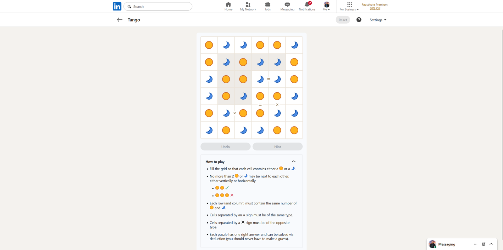 Окей, так что головоломка Tango, в которую я играю сегодня, начинается с восьми уже заполненных квадратов, что просто отлично! И честно говоря, подсказки для этих начальных квадратов довольно простые – очень легко начать!